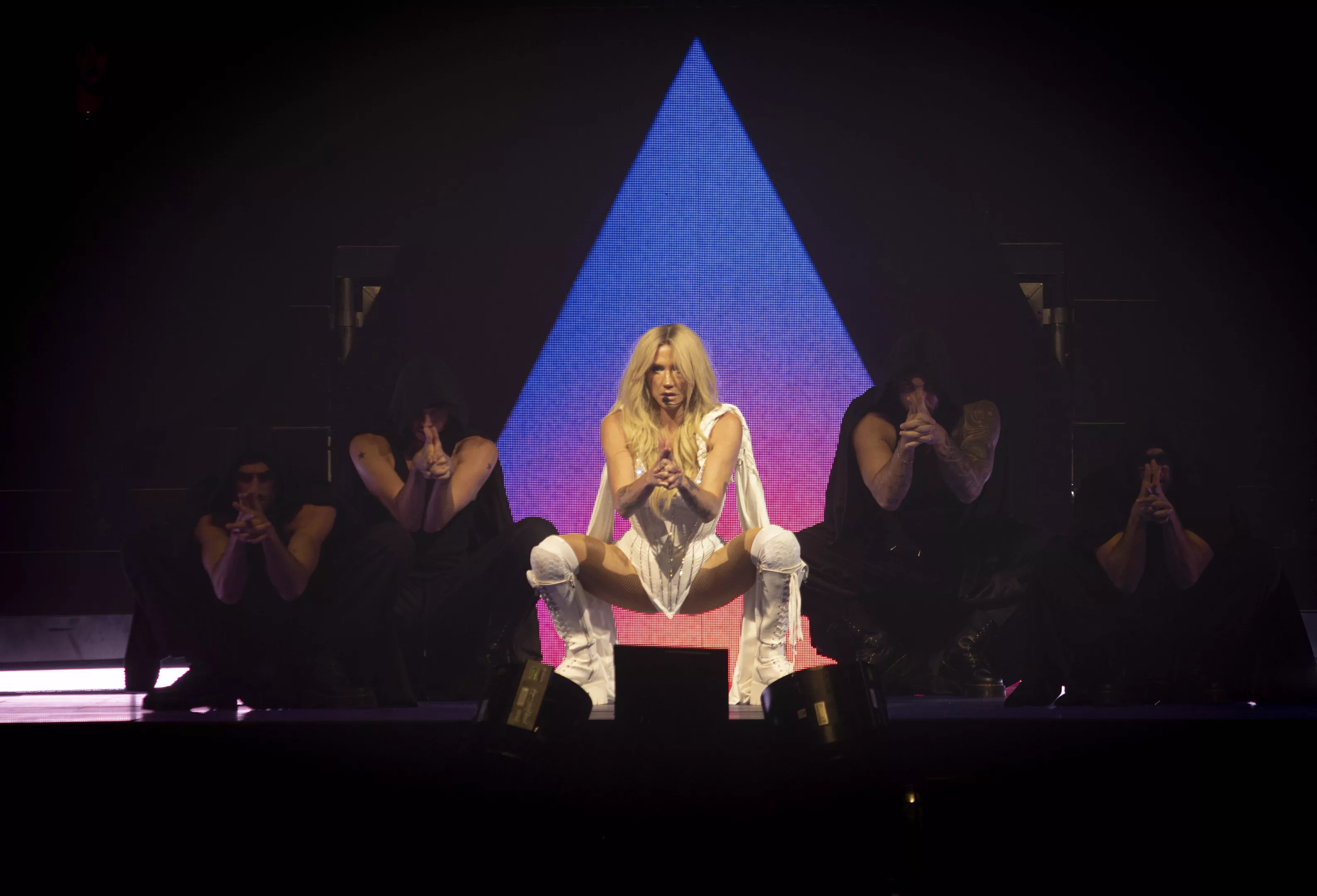 The semi-disgraced producer is never mentioned by name, but Kesha’s past struggles still haunt the show. The staging is rife with symbolism. During “Fine Line,” Kesha sports a straitjacket and struggles to break out of it in front of a striking wall of flashing iPhone cameras.