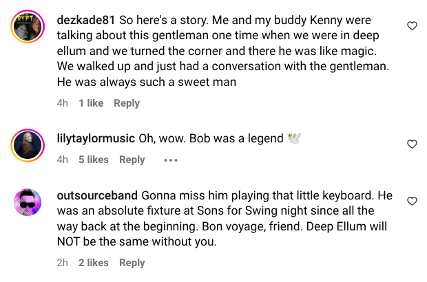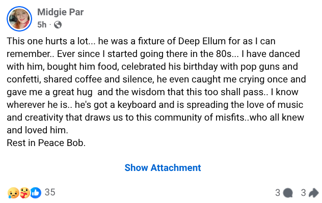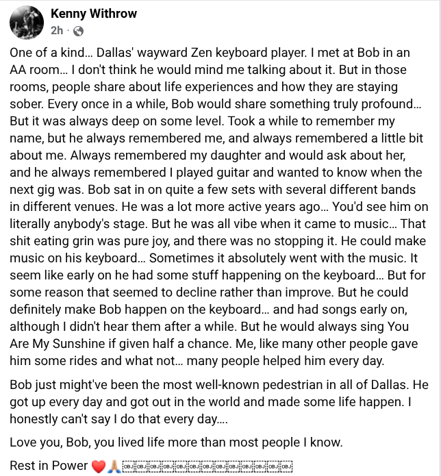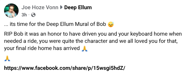 Bob Crawford, known as “Keyboard Bob” and “Deep Ellum Bob,” has passed away.