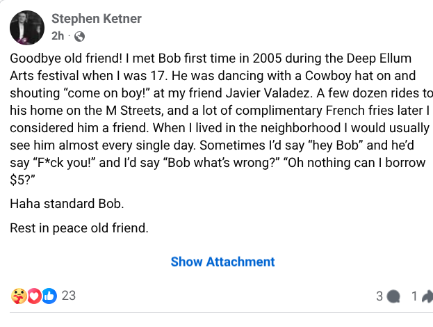 According to His Name Is Bob, the Facebook page for his 2010 documentary, Dallas’ famous drifter passed peacefully on Sunday, Aug. 10, in the morning. A celebration of life will be announced shortly.