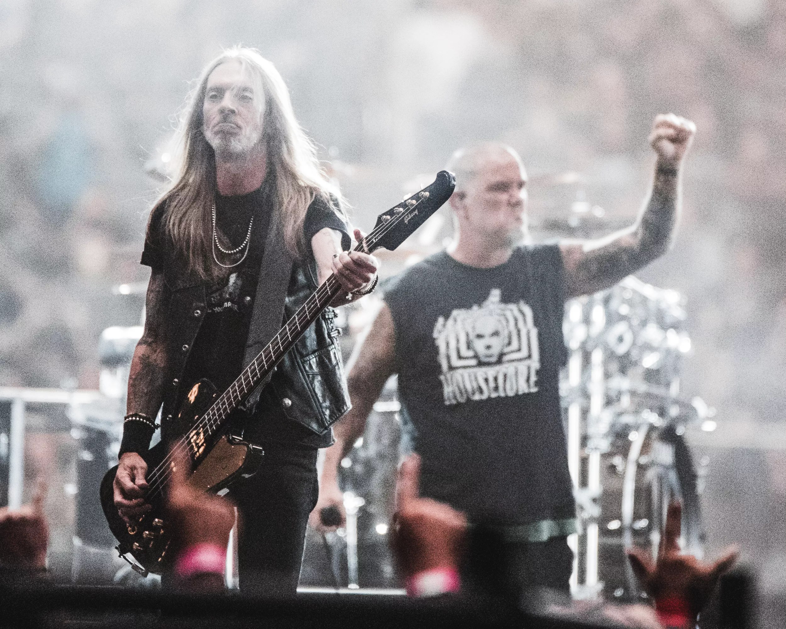 Unlike Mammoth, all of Pantera’s members made use of the full stage, even Benante, who would switch kits on opposite sides of the stage during the set. Singer Phil Anselmo commanded the audience to raise its fists and Wylde got into audience members’ faces with a blue Flying V guitar with a lightning bolt across its face.