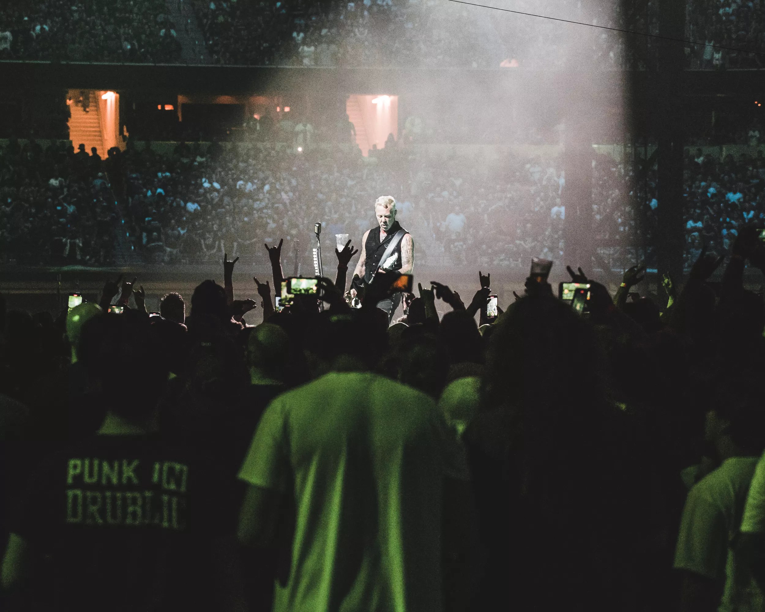 After a blackout, the stadium was split between purple and aqua light, Hetfield now facing west, and slowly singing the opening of “Welcome Home (Sanitarium).”