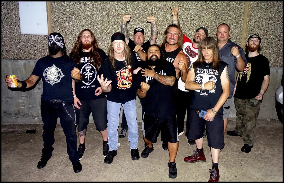 Past and present members of Warbeast gather for the band’s final performance. From left to right, Bobby Tillotson, Drew Shoup, Bruce Corbitt, Casey Orr, Scott “Shelbeast” Shelby, Joey “Blue” Gonzalez, Andre Karst, (crew member) Larry Holmes, Alan Bovee, and Lyric Ferchaud.