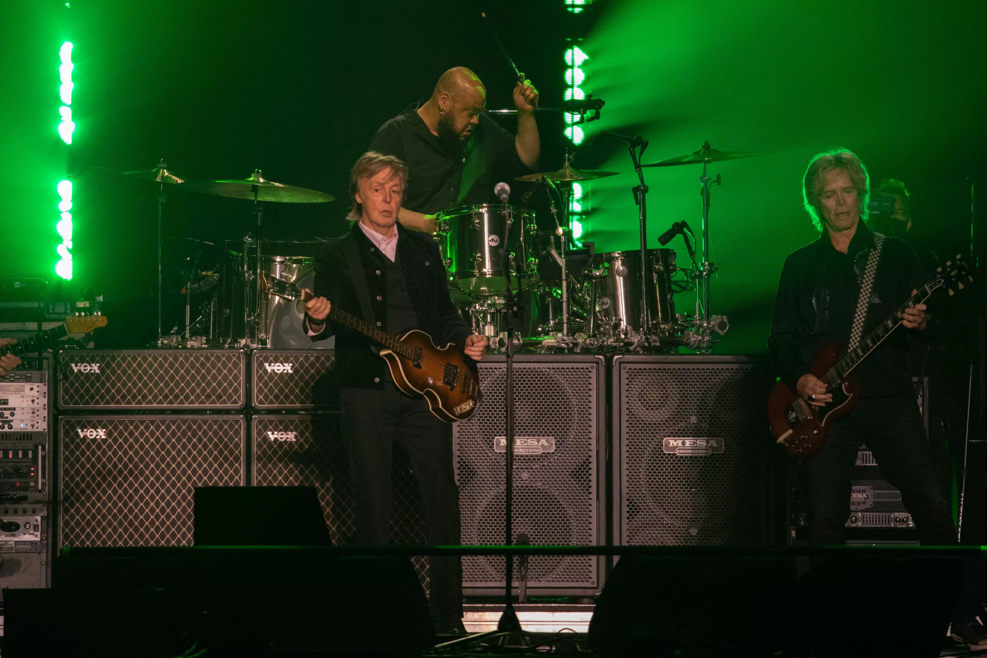 The setlist spun easily between past and present – “Junior’s Farm” followed close behind by “Got to Get You Into My Life,” with “Let Me Roll It” and “We Can Work It Out” not long after – and the affable McCartney held it all together with his undimmed charisma. (“We know what songs you like because the room lights up with phones – it’s like stars,” McCartney cracked at one point. “When we do a new one, it’s like a black hole – but we’re gonna play ’em anyway!”)
