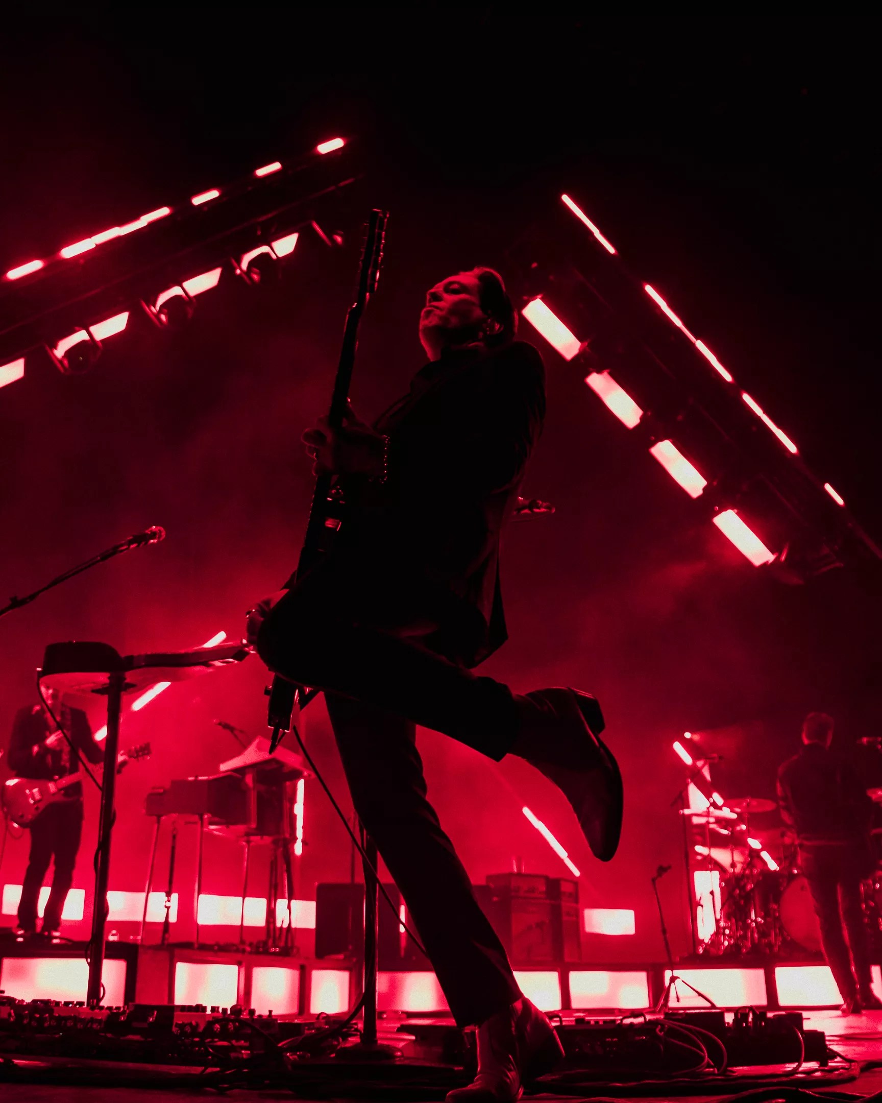The band kicked off the next part of their set with a new song off 2023 album In Times New Roman… followed by “If I had a Tail.” The crowd’s attention had yet to falter with every twist and turn the band made from song to song over multiple albums. “Time & Place,” next in the set, had keyboardist and guitarist Dean Fertita pulling double duty, ripping a psychotic guitar solo while perched above the band on a stage riser to the left. The complex rhythm and melody of this song had every musician in the room carefully dissecting each member’s contributions. “Into the Hollow” was followed by “Carnavoyeur” from Times New Roman….