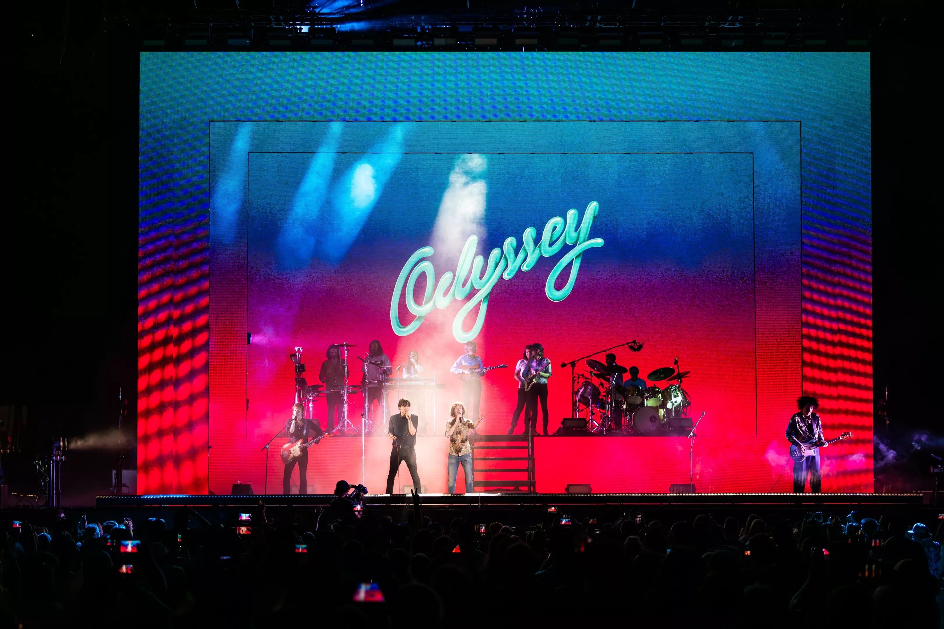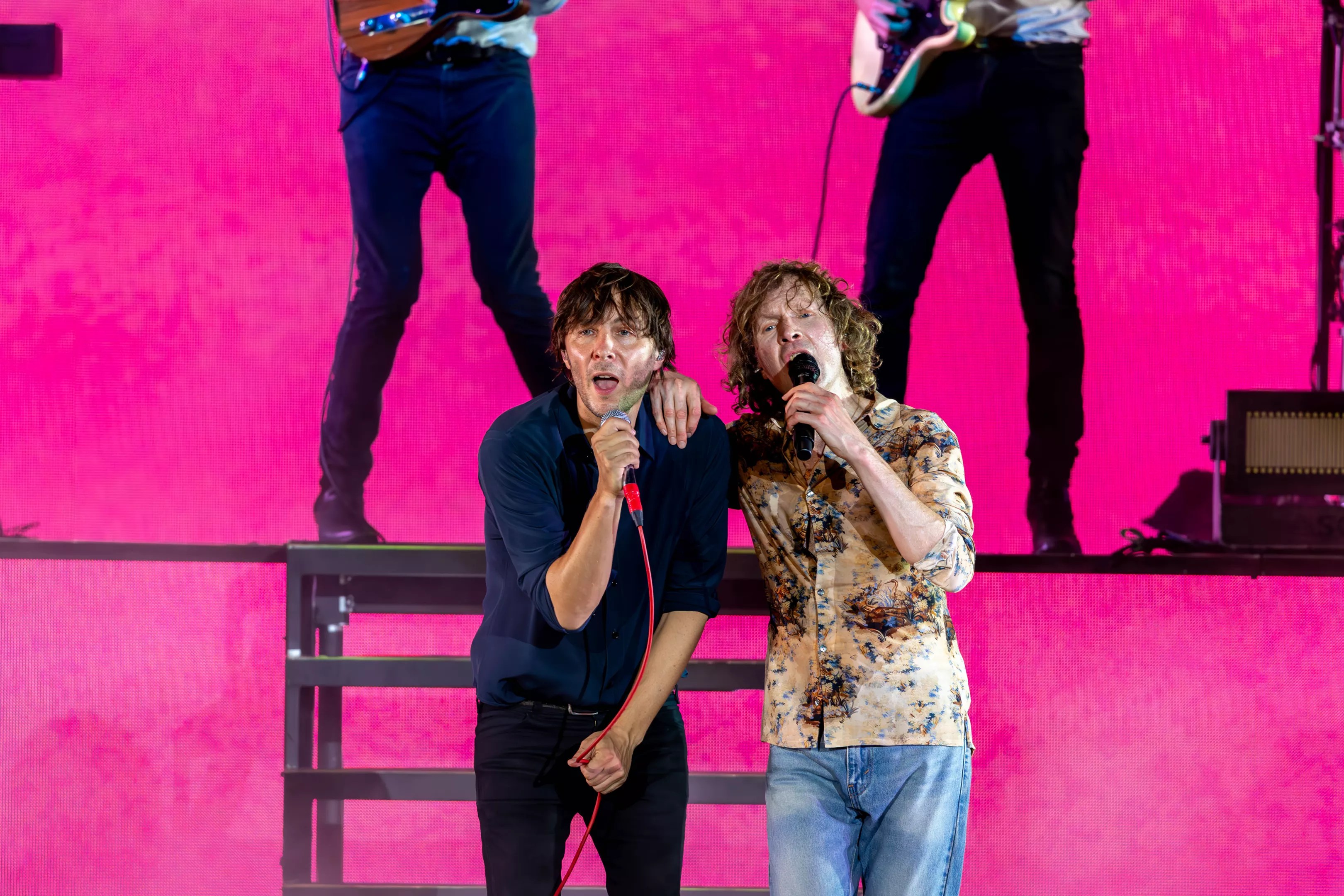 Beck (right) and Phoenix singer Thomas Mars sing “Odyssey.”