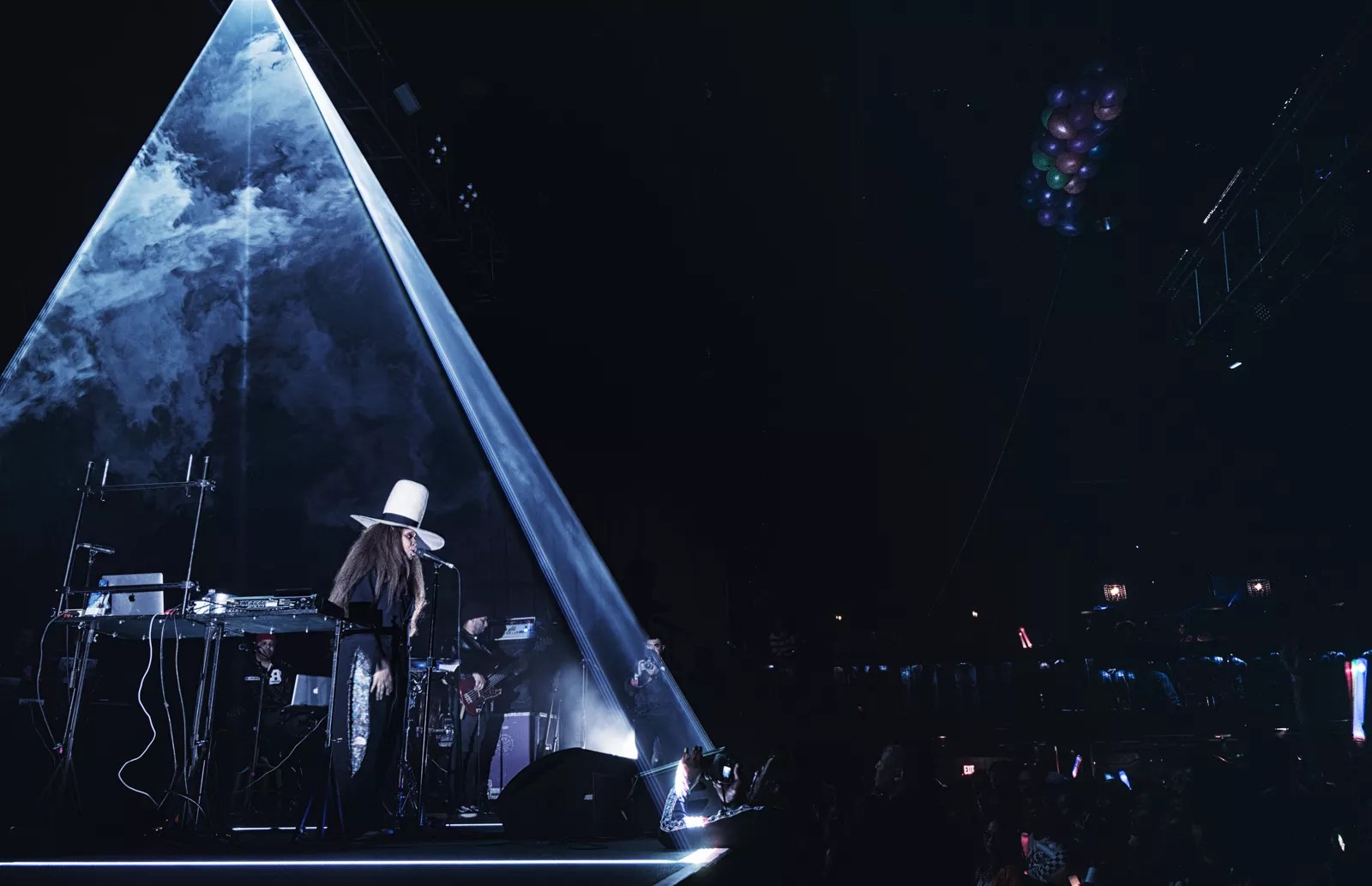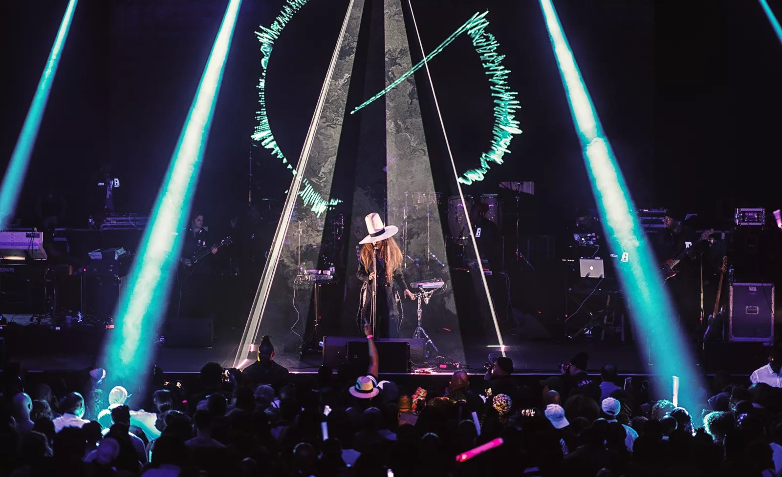 Her voice was heard first, right at midnight, appropriately greeting her guests with the line “Hey, hello” from the song “Hi.” Badu showed herself in a giant white hat and a coat and spent her time onstage next to a dozen accompanying musicians, a new-age pharaoh protected inside a pyramid of lights.
