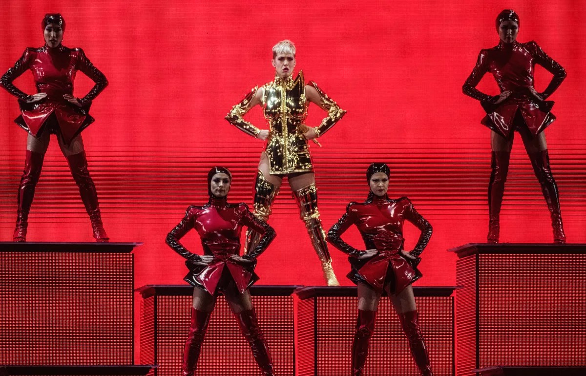 Perry’s not just powerful; she’s funny, too, and those aspects of her personality shone throughout the show. It was like an early Mardi Gras celebration inside the arena. For example, confetti dropped from the ceiling no fewer than four times, giant puppets were used during several numbers, a costumed man on stilts played the part of an alien during “E.T.” and her six female backup dancers donned outlandish getups (such as TVs on their heads) to perform kick-line-inspired routines.