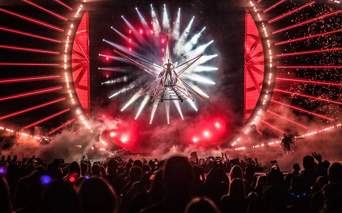- A garden of 12-foot-tall roses that sprouted along the teardrop-shaped stage during “Tsunami” from her new album, Witness. Perry and a male aerialist rode the revolving rose at the tip of the stage much like an exotic dancer does a pole. Perry’s male accompanist performed the highly gymnastic feat effortlessly.