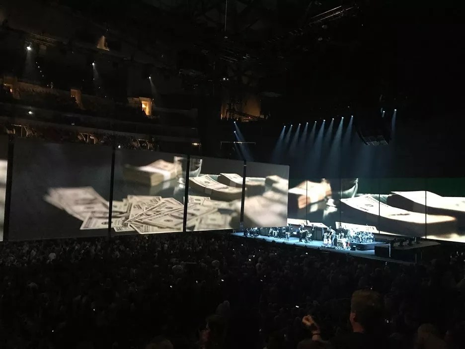 Later, during “Money,” various images representing corporate and government corruption filled the screens as coins and dollar bills piled up.
