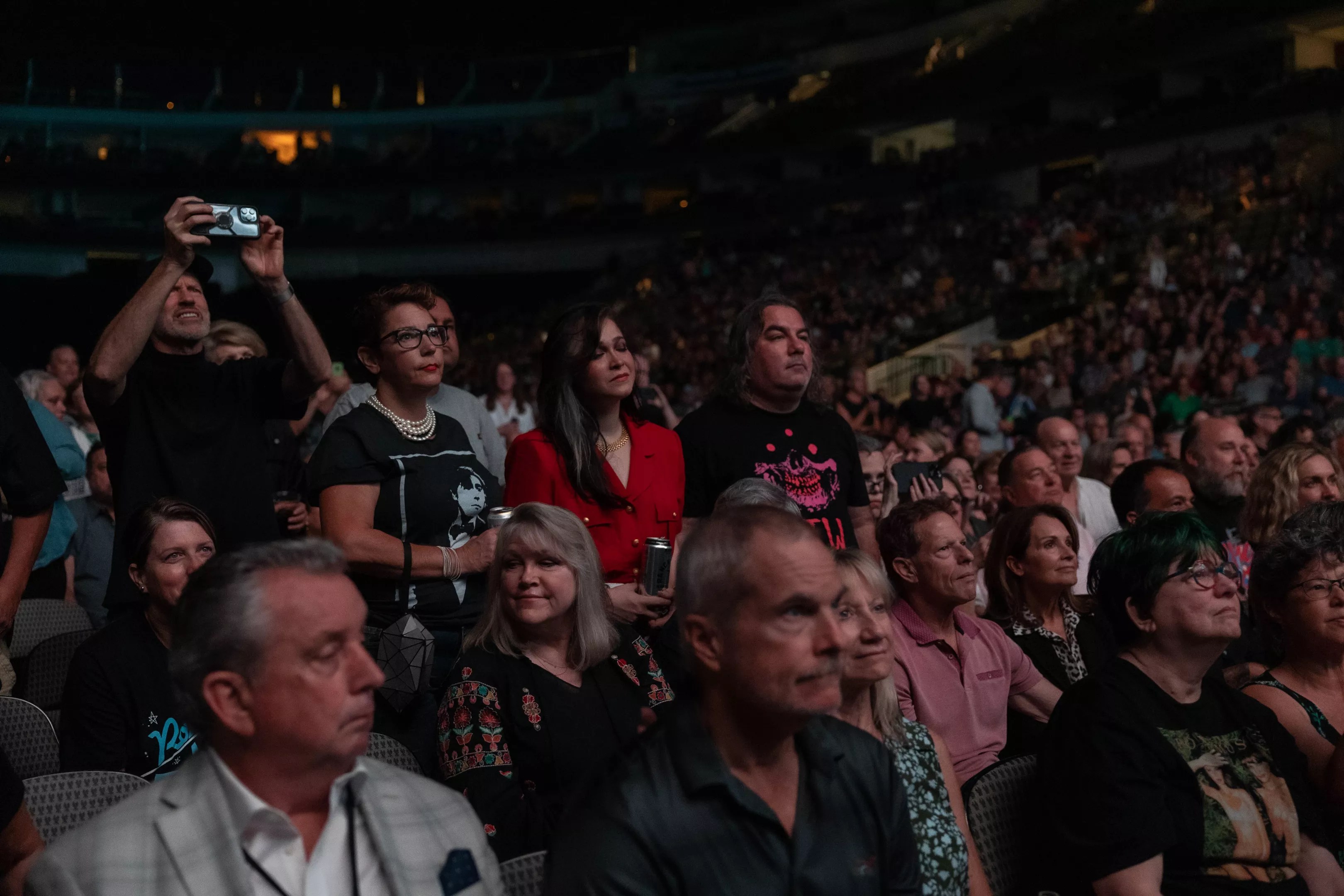 There was a clear distinction between fashion choices among audience members. Ostensibly in tribute to Roxy Music’s early days when they dressed in outrageous costumes and their latter days when they restricted themselves to what seemed like only the finest eveningwear, the audience was a mix of younger people wearing suits, evening dresses and flashy costumes – with some women going so far as to dress like the models Roxy Music have used on nearly every one of their album covers – while the older crowd stuck to mostly a T-shirt and cargo shorts look.