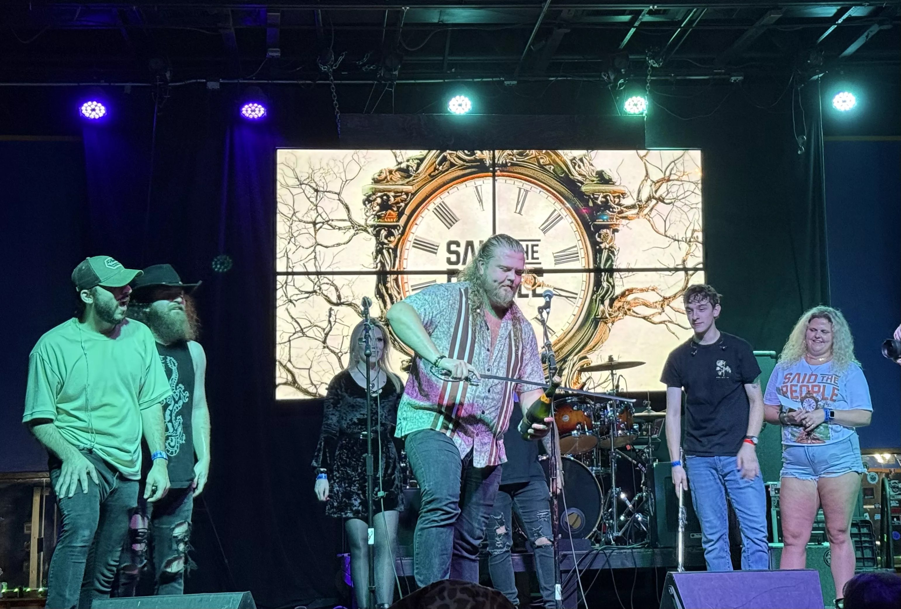 After the show, friends of the band came onstage with a cake and a bottle of Champagne. Bartone announced that Leavoy’s mother’s birthday would have been July 29, and they wanted Leavoy and his sister Lexi to make a wish in her honor. Someone in the crowd produced a saber (yes, an actual saber) to open the Champagne.