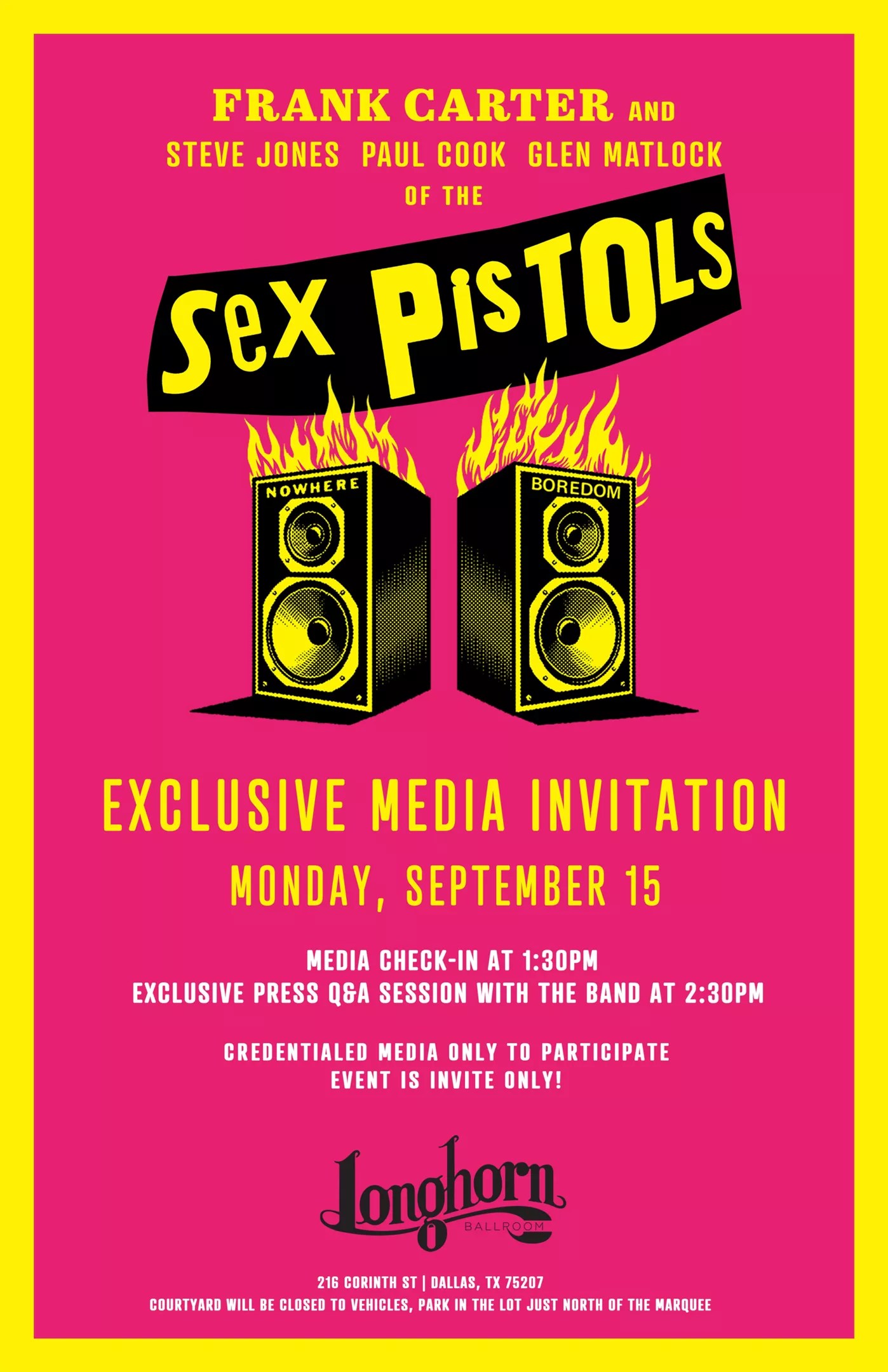 Sex Pistols was scheduled to host a media-invite-only press conference on Monday, Sept. 15, moderated by Robert Wilonsky of The Dallas Morning News.