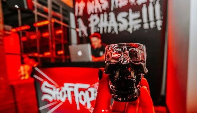 One of the most popular is The Taste of Ink, a potent reference to the most famous song by The Used that’s served in a skull shot glass with black dye and edible glitter.