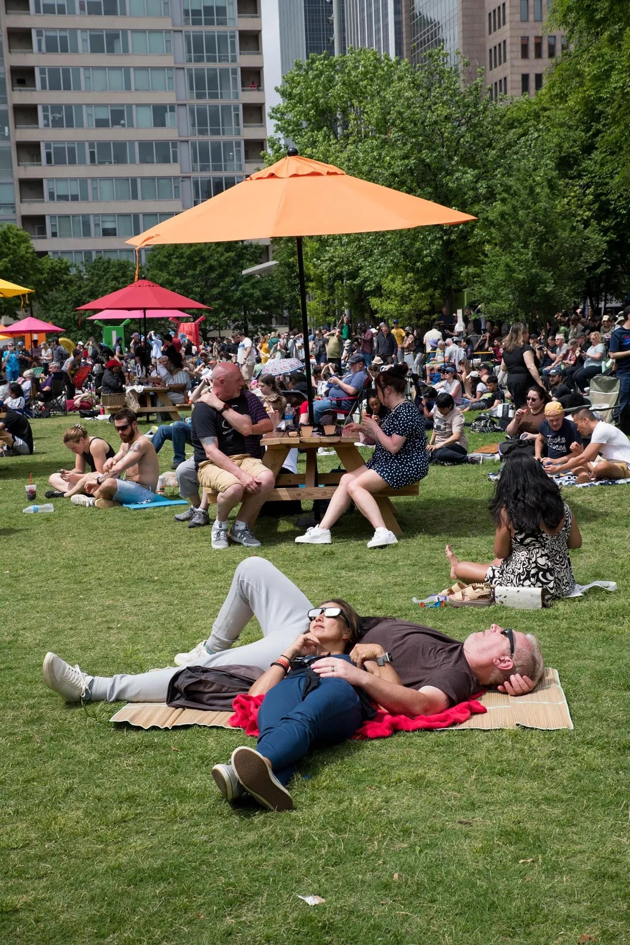 Even hours before Dallas would see the eclipse go full, people in lawn chairs with telescopes and camera equipment were set up in the grassy areas of Dealey Plaza. Nearby, on the sidewalk in front of the Sixth Floor Museum, a vendor sat behind a table piled with eclipse-themed T-shirts. Near Turtle Creek and Cedar Springs a bit later, a vendor selling eclipse glasses strolled along the sidewalk, and a healthy smattering of spectators had gathered on a hill at Griggs Park. The recently spruced-up Main Street Garden park also played host to many eclipse chasers, including a good number of out-of-towners.