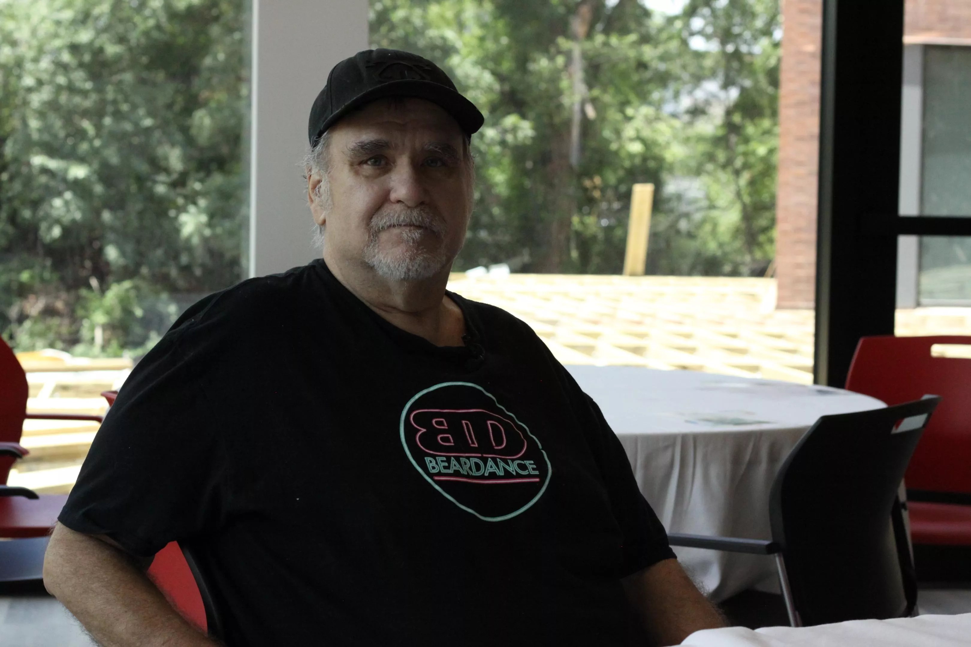 Mike Montalvo, a future Oak Lawn Place resident, sits in the community room at the apartment complex where events will be held.