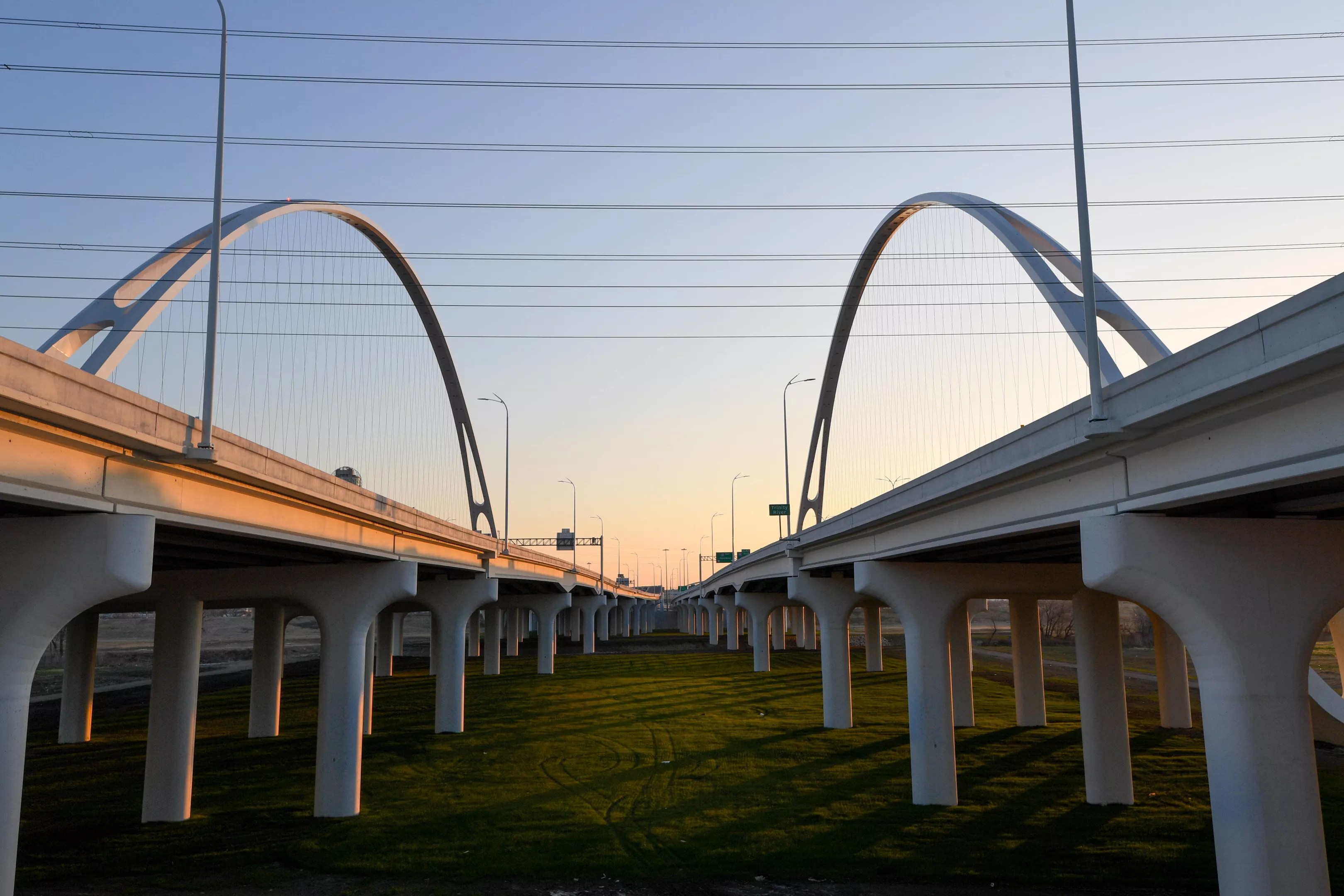 The Margaret McDermott Bridge encompasses four structures: eastbound and westbound highway bridges and hike and bike suspension arches at their flanks.