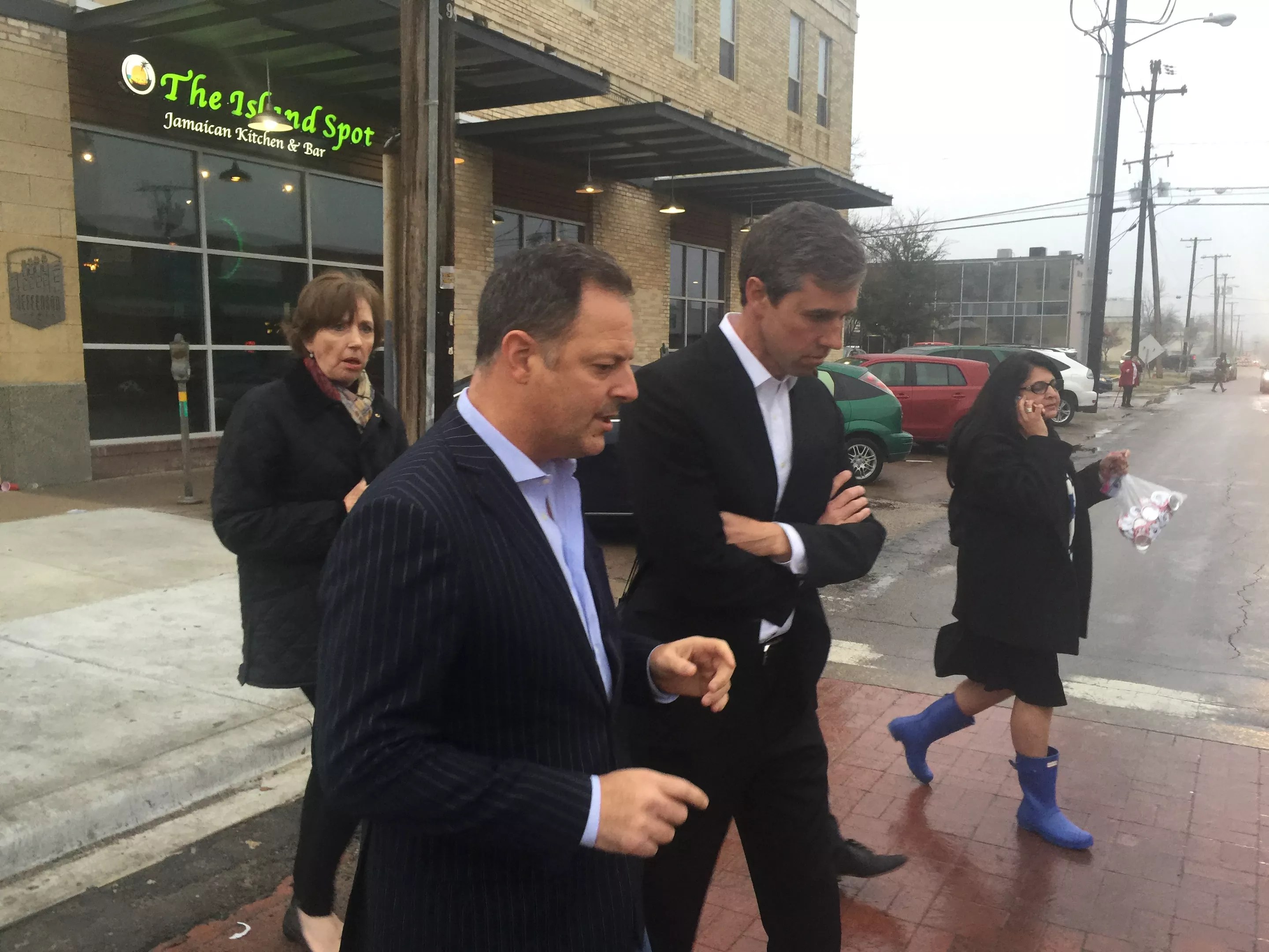 State Rep. Rafael Anchia (left) heads to the Texas Theatre with O’Rourke during a brief tour of the local businesses along Jefferson Boulevard.