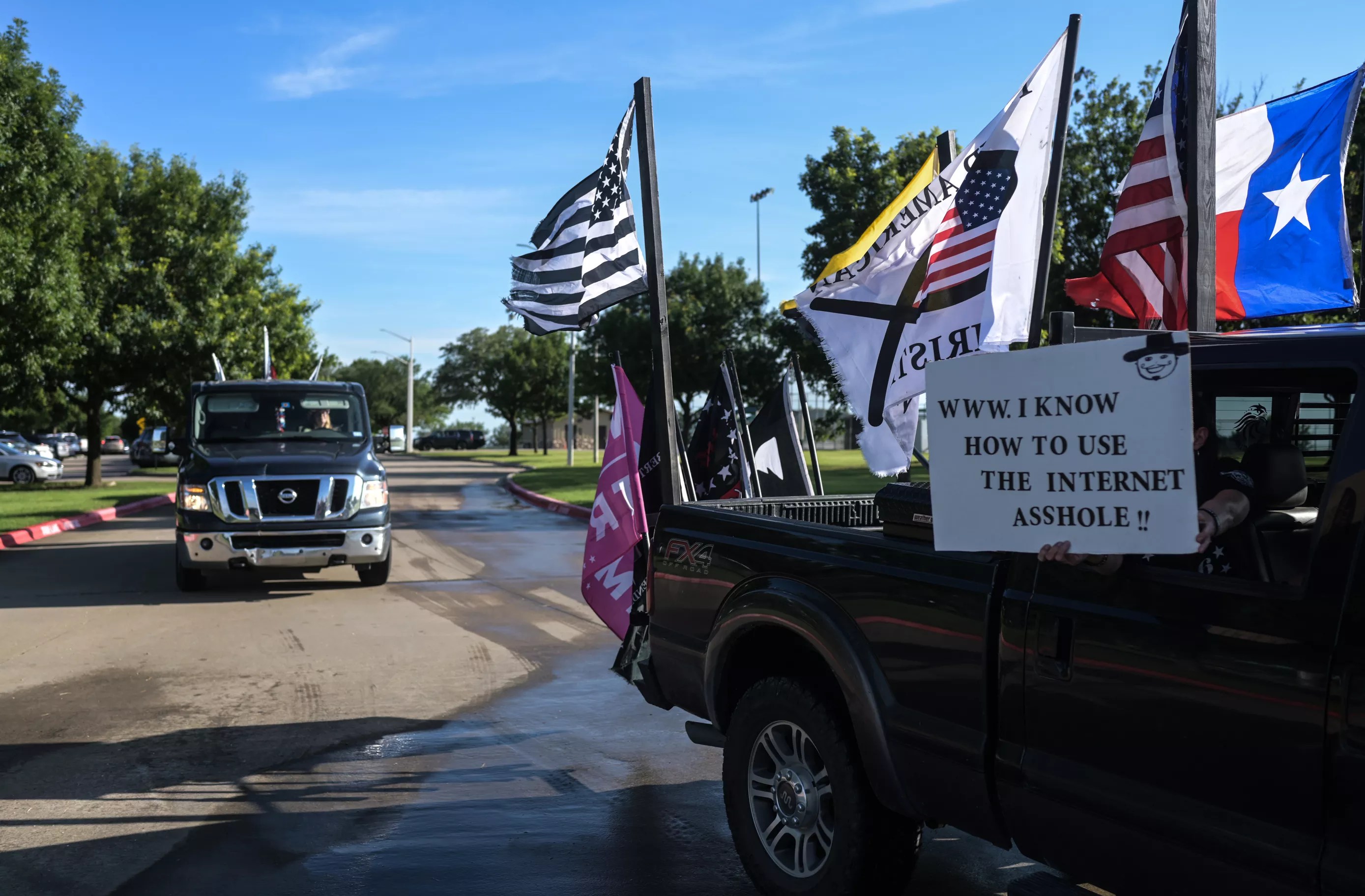 Some flew large flags bearing the “Don’t Tread on Me” logo and former President Donald Trump’s name.