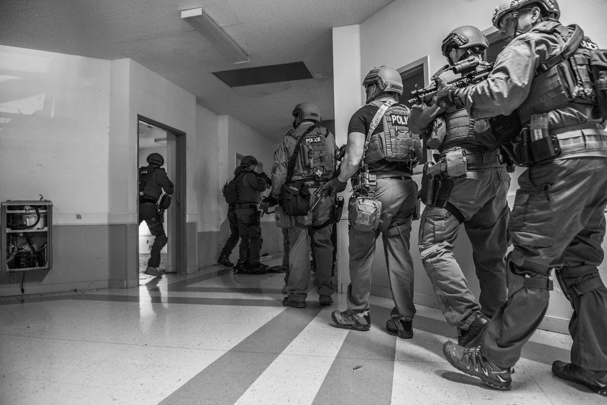 “High, low, left, start clearing on the right,” the SWAT team leader calls out from the shadows as his tactical officers move silently but quickly.