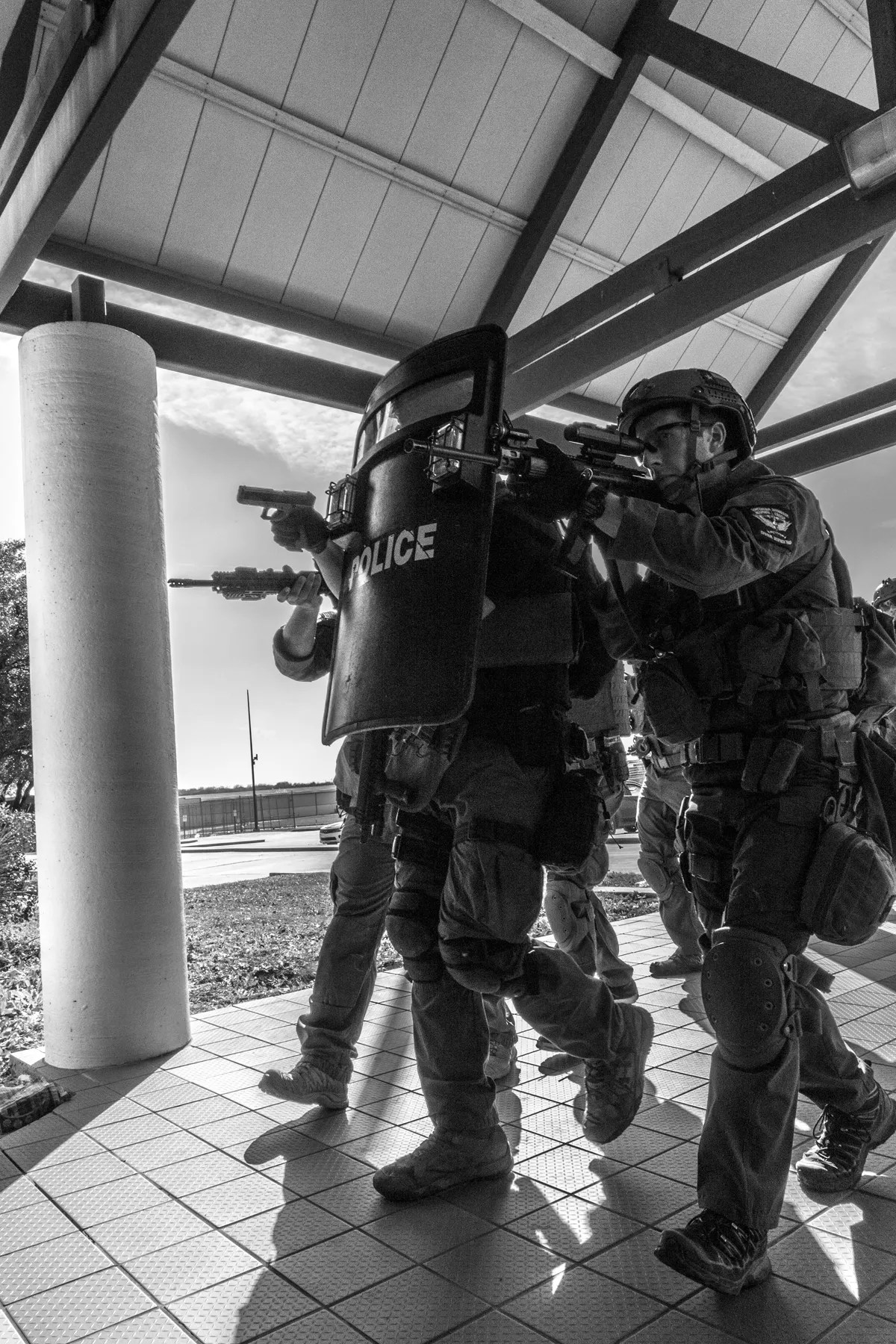The SWAT officers cover each other in an active-shooter scenario.