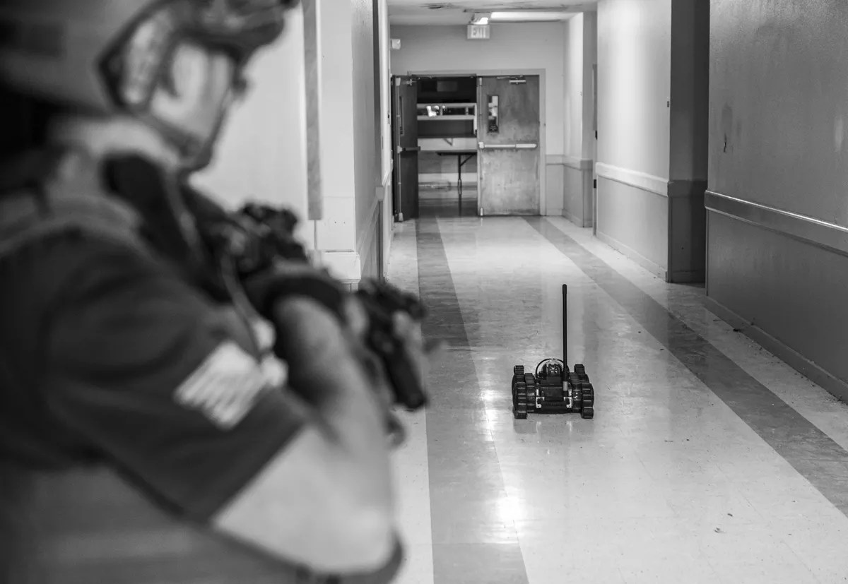 SWAT members cover a hallway while a remote-controlled robot performs video reconnaissance.