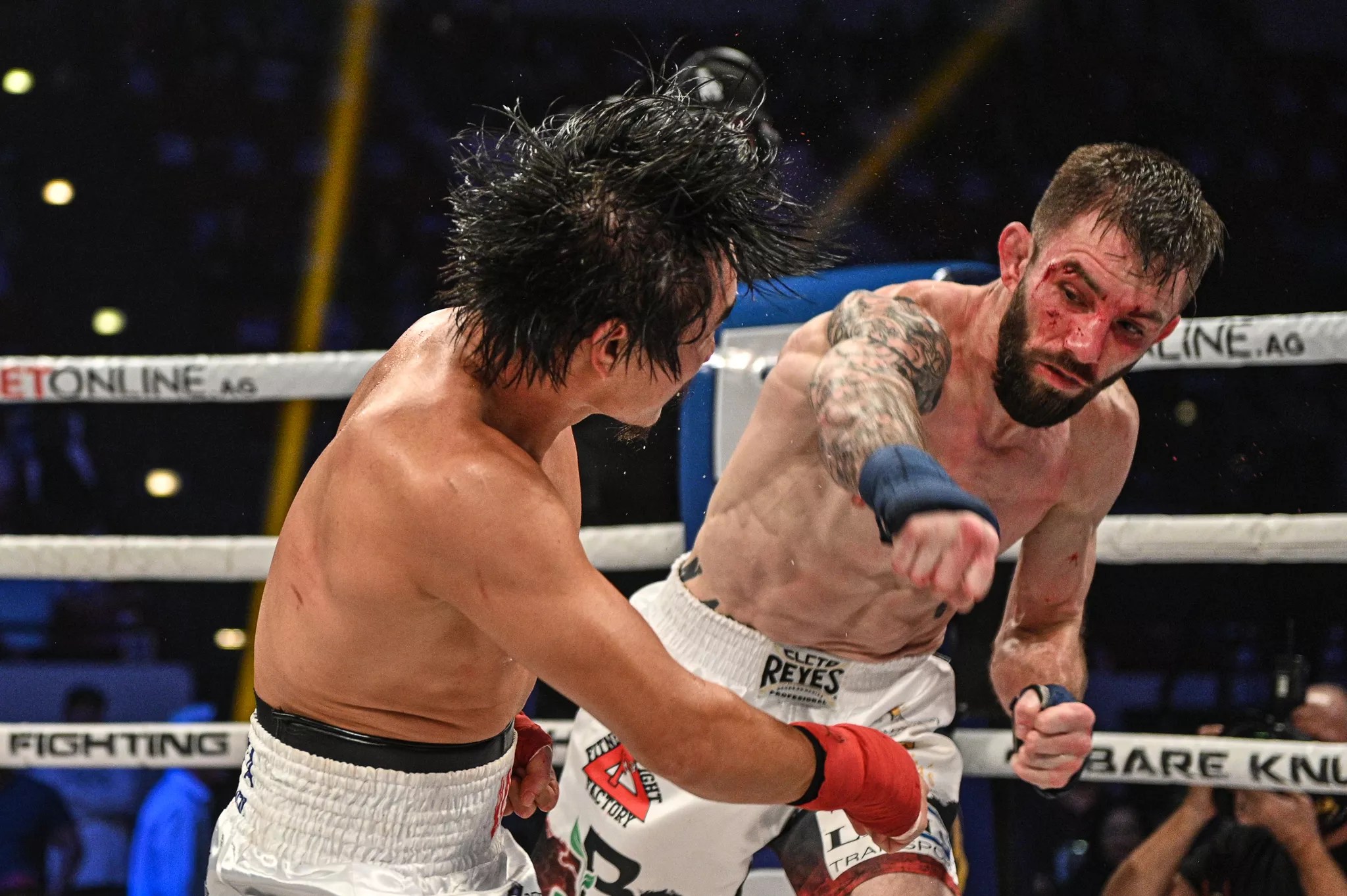 Opponent Dat Nguyen ducks Bedford’s jab and delivers an uppercut hook.