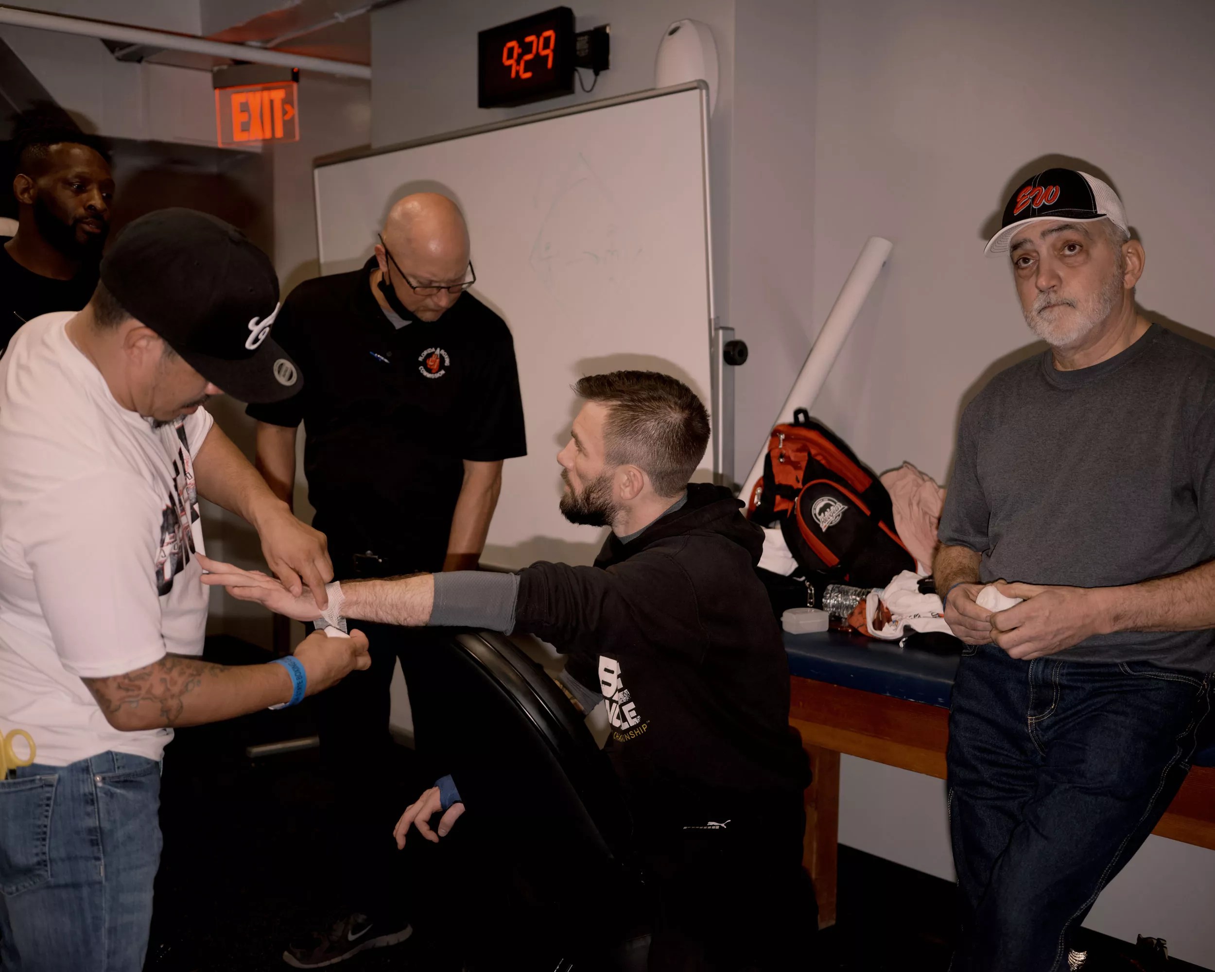 Bedford and his team prepare for the fight. Bedford’s father (right), John Bedford, is there to support him.