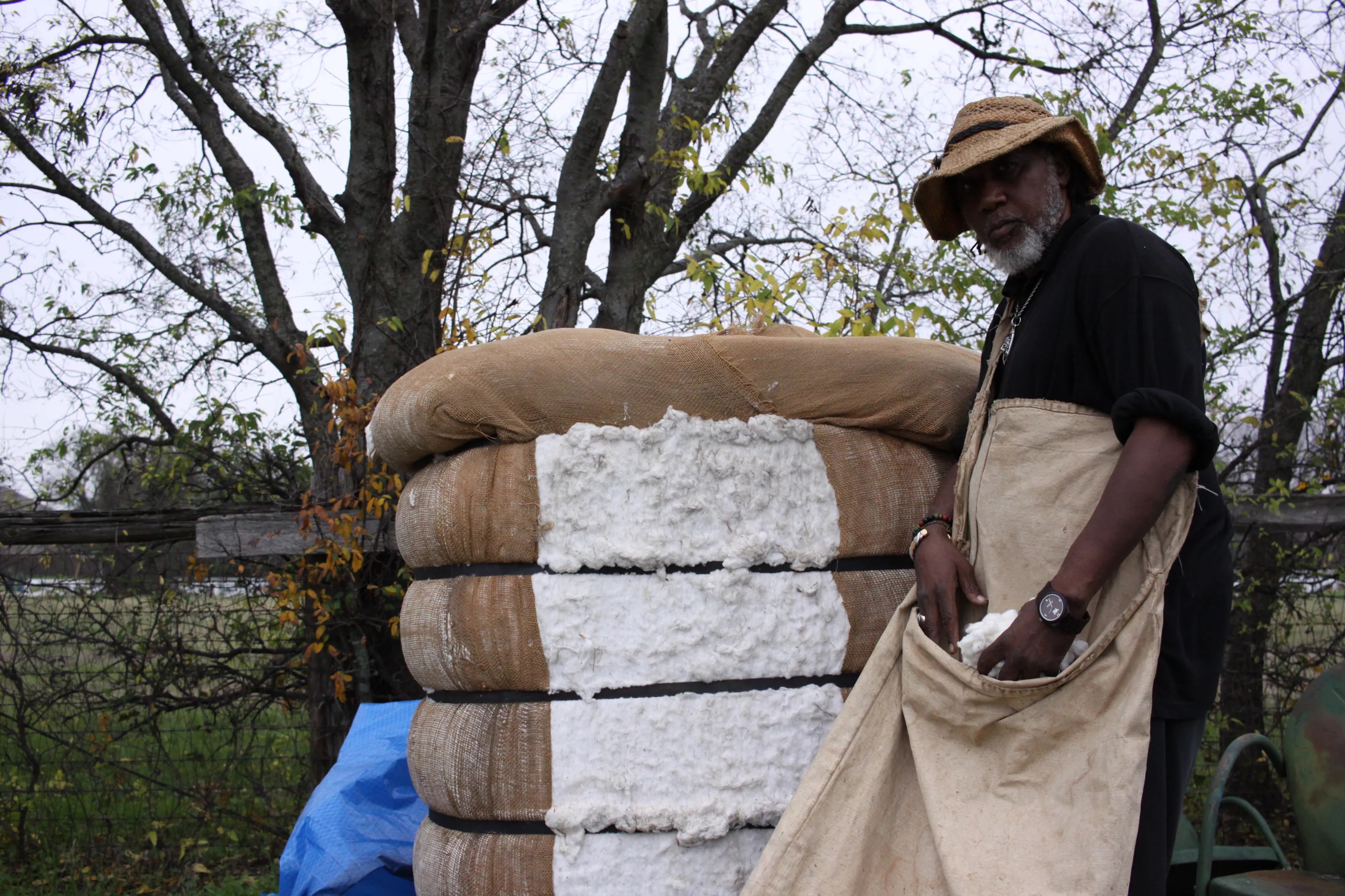 Out on a rural piece of land in Lancaster, Clarence Glover stepped up to a structure that sat on a wooden pallet and was wrapped in a blue tarp. Storm clouds overhead spat out a light drizzle as Glover untangled knotted up bits of bungee cable that held the tarp down. When he was done, Glover revealed what was underneath – a 500 pound bale of white gold, otherwise known as cotton.
