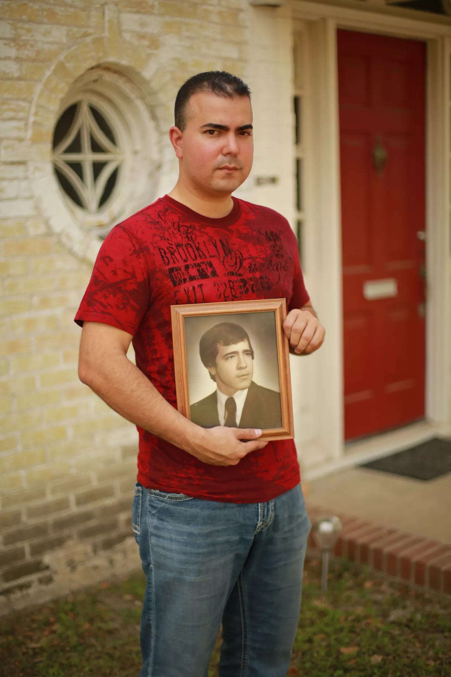 Joey Cepeda holds a photo in front of his father’s house in McAllen.