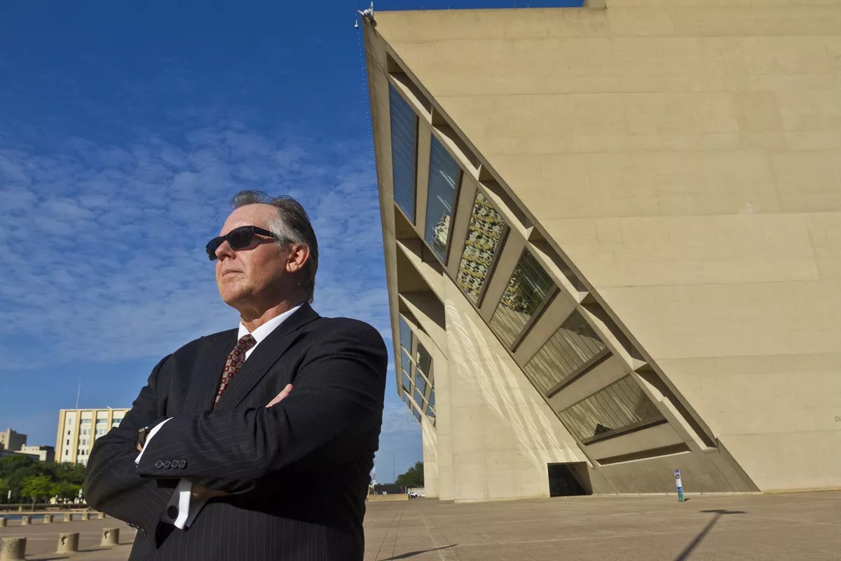 Kevin Page stands in front of Dallas City Hall, which was altered with CGI to become part of a dystopian future Detroit in RoboCop.