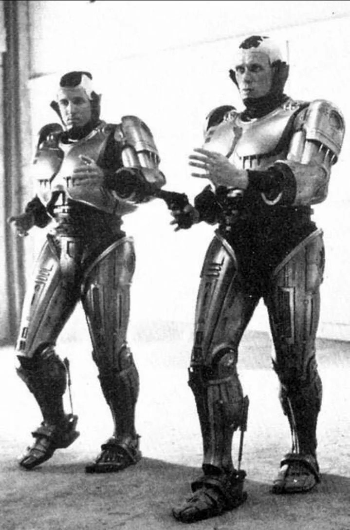 Russell Towery (left) works with actor Peter Weller as a stuntman for the original RoboCop.