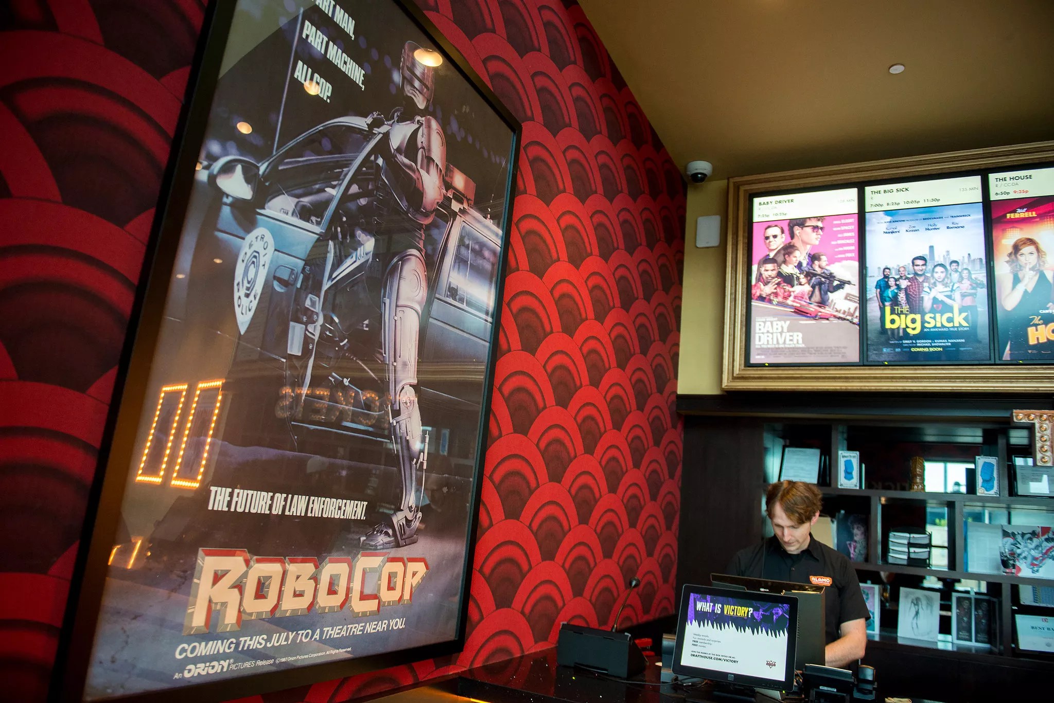 An original RoboCop poster hangs inside the Cedars location of Alamo Drafthouse.