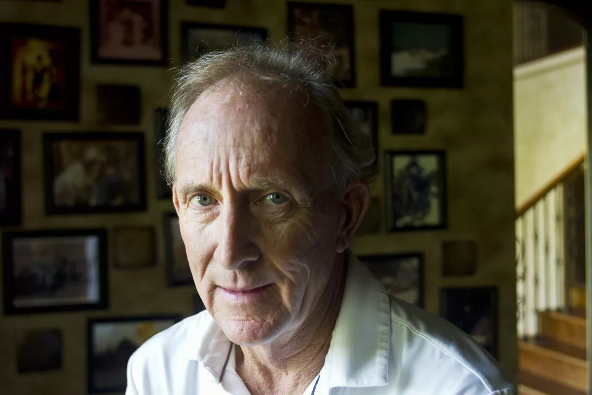 Russell Towery stands before a wall of his film photos as a stuntman.