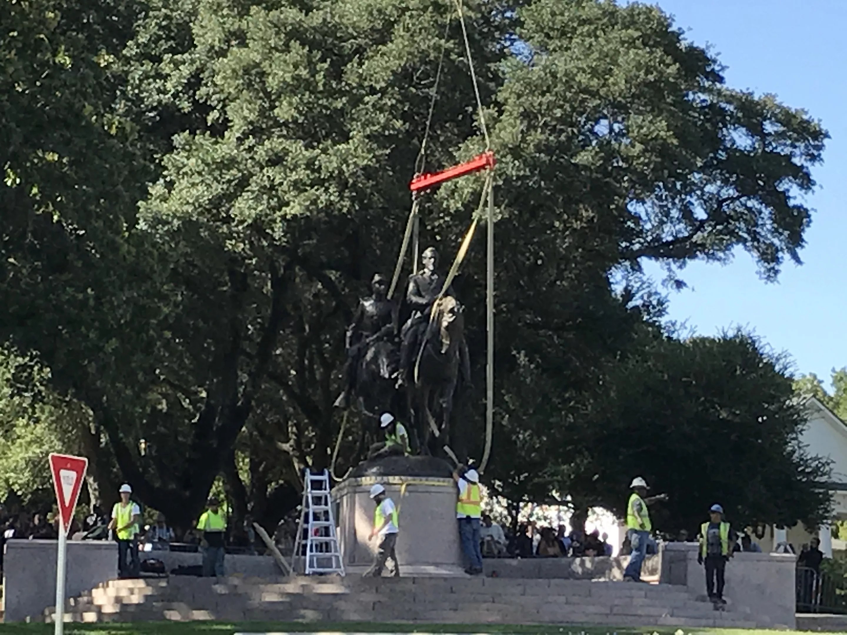 A strange on-again off-again drama ensued at Lee Park on Turtle Creek Wednesday after a City Council vote to immediately remove a large equestrian statue of Confederate General Robert E. Lee. A large crane, already looming over the statue during the council debate, seemed ready to yank the statue from its base. But straps were removed at the last minute and work stopped when word arrived of an injunction to stop the removal.