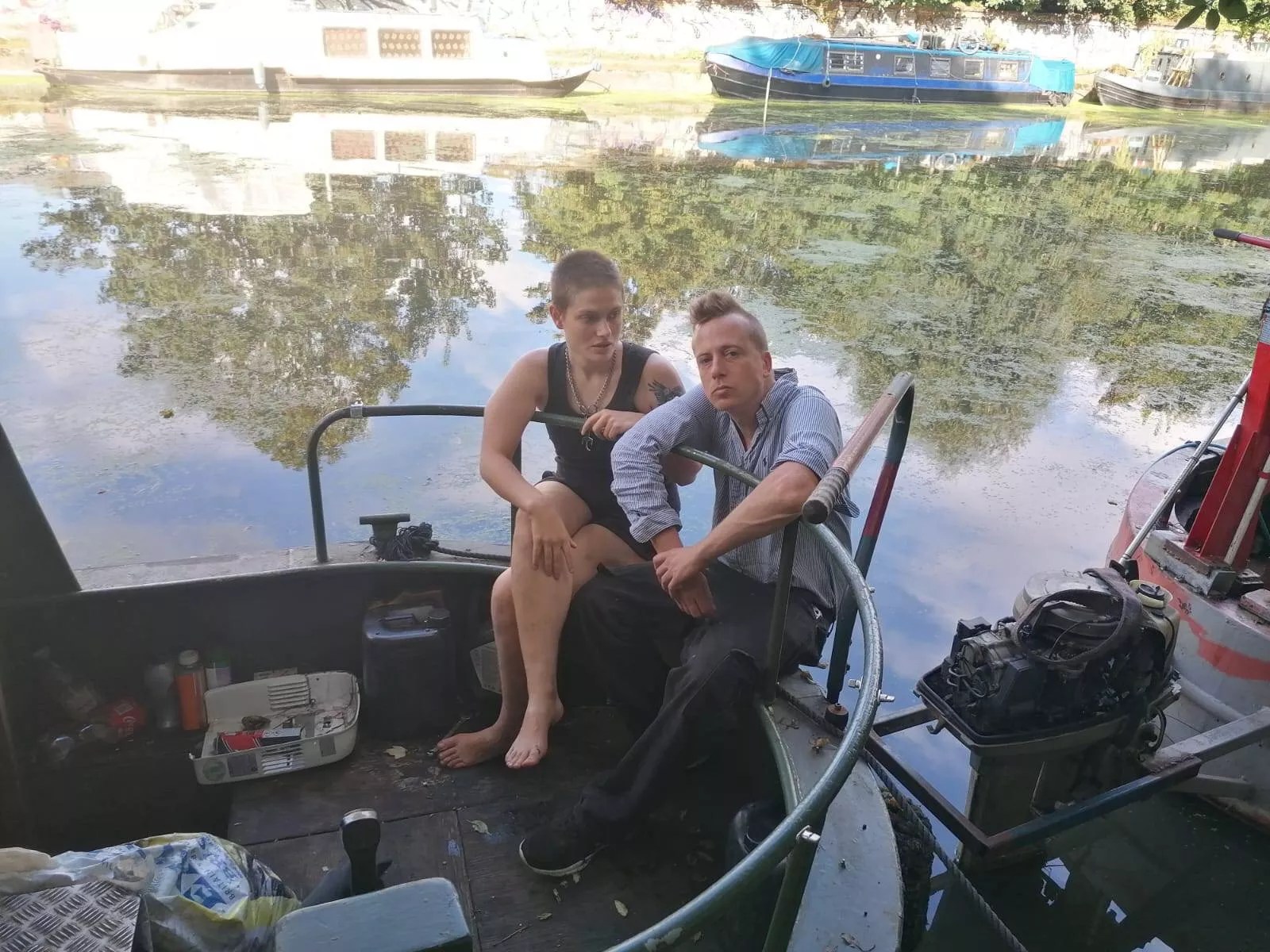 Sylvia Mann and Barrett Brown sit on their London houseboat.
