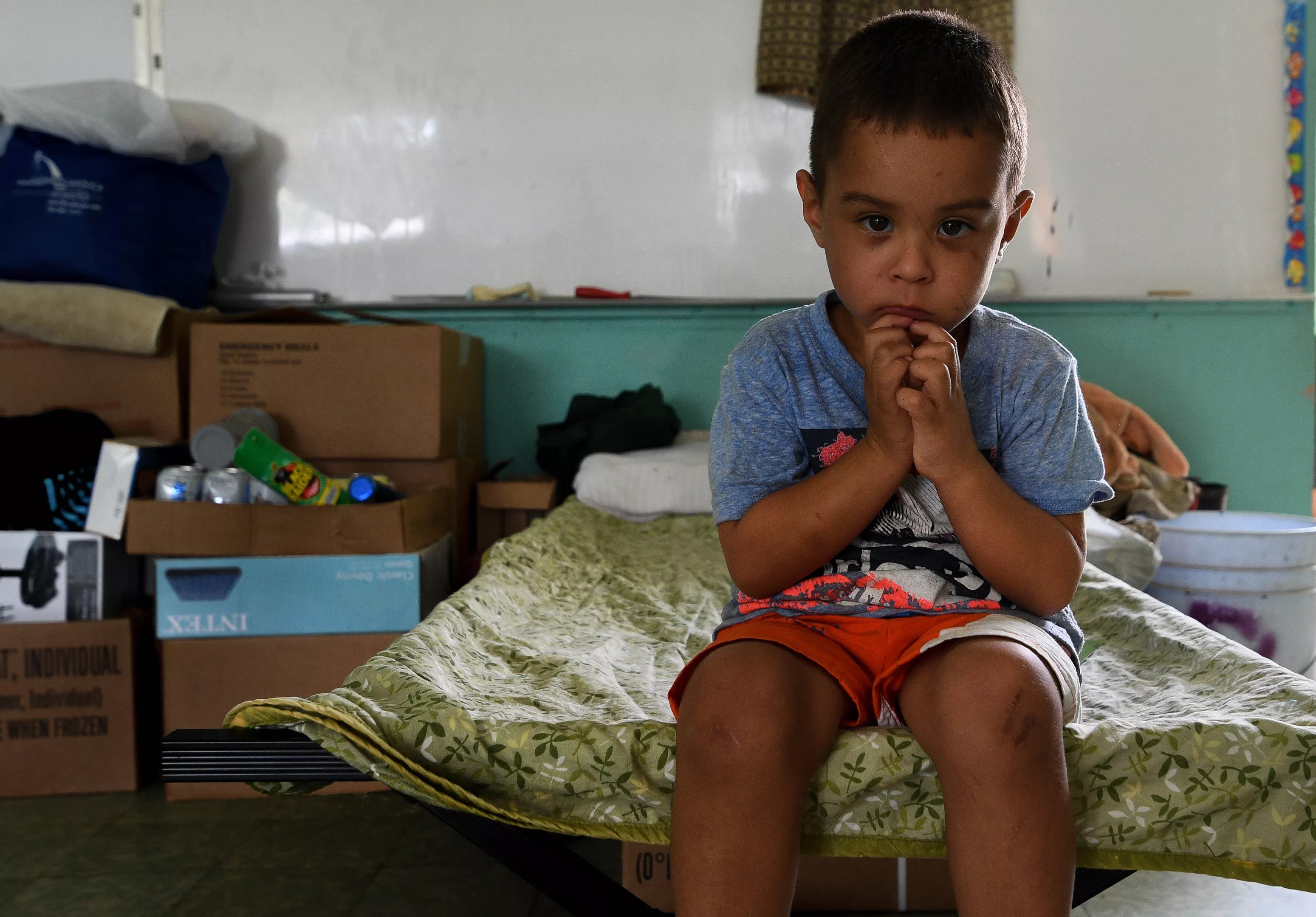 Five-year-old Jeyden Quinones isn’t used to the food the military has given him. He wants plantains, his favorite food. Over the past few months, he and eight family members have been sharing one room and four beds in the cramped Jayuya school shelter that remains without power. Although they’re strapped for cash, his family used the last of its money to buy a small stove so that Jeyden can once again eat plantains. It’s the last thing left of home for him, his mother says. “The wind took my house,” the boy says. “The hurricane made my house explode. I only have hope in God now.”