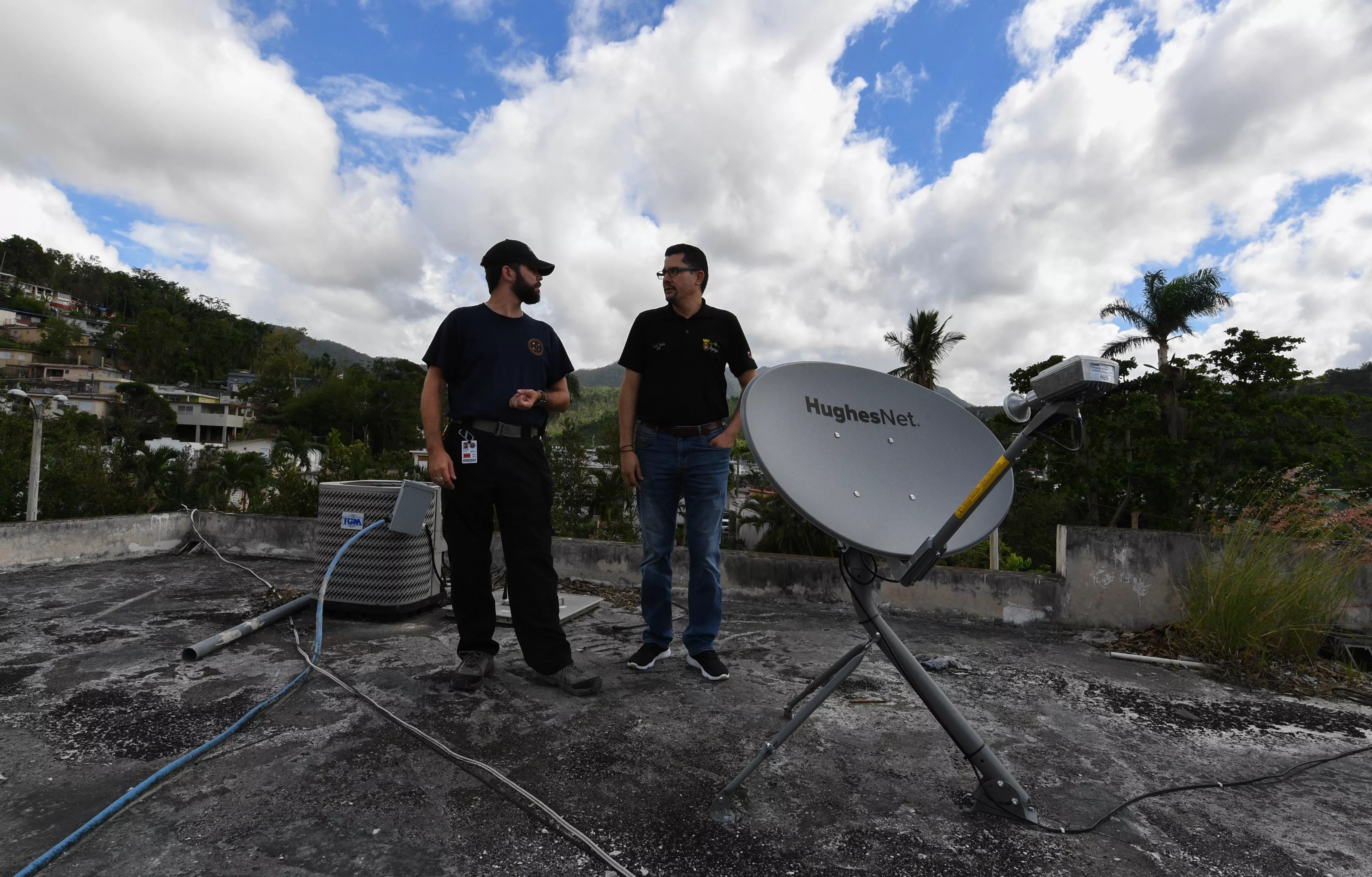 Darrick Kouns, a volunteer with Dallas-based nonprofit Information Technology Disaster Resource Center, discusses with Luis Seda, the network administrator for the mayor’s office in the mountain village Jayuya, how they can supply communications for the local shelter. ITDRC deploys volunteers from all over the world to provide communities affected by disasters with resources to recover their IT infrastructure. Providing internet access and phones helps families reconnect when separated and aids businesses in reopening.