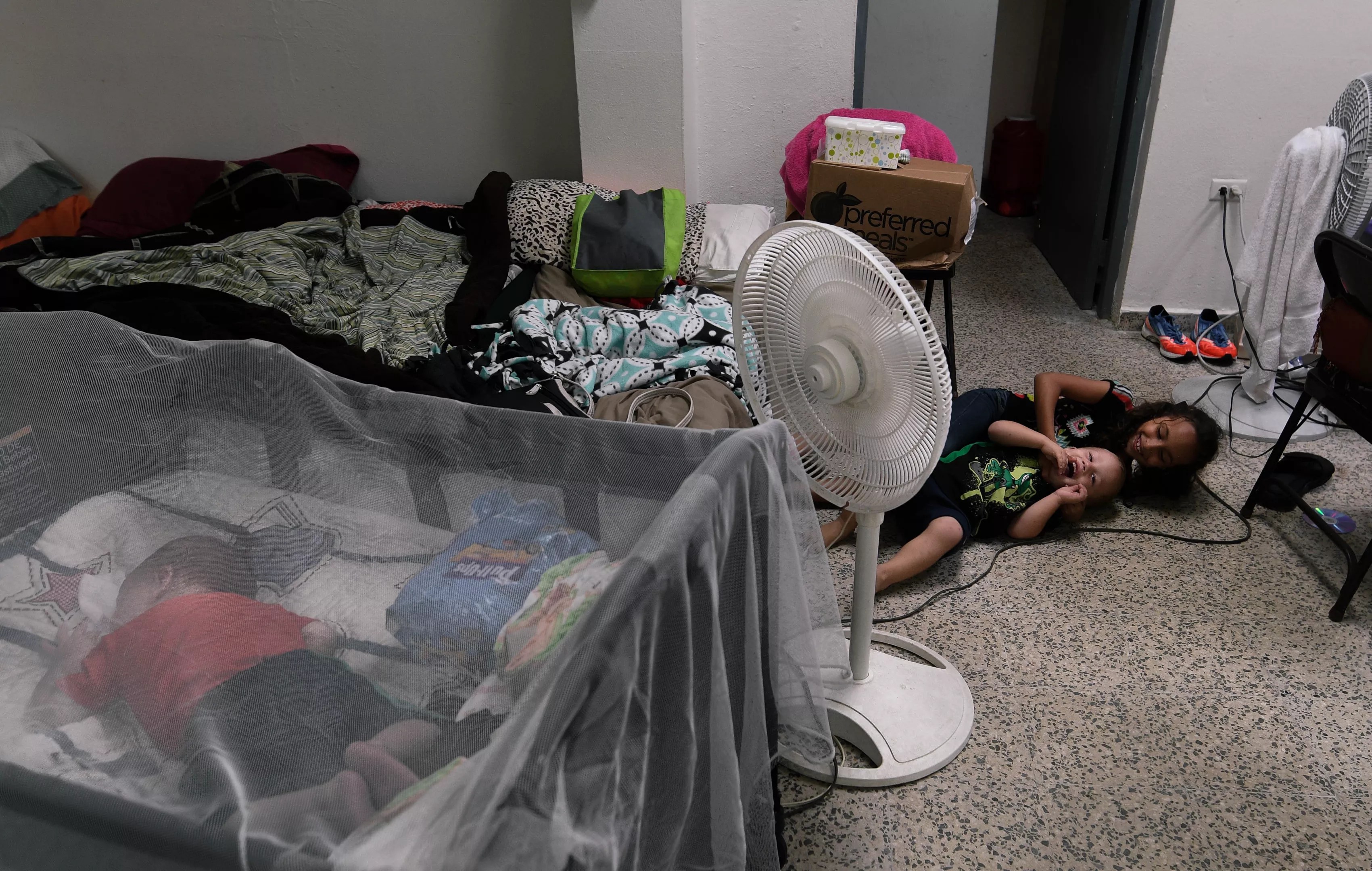 Four-month-old Kaleb Hernandez sleeps while his brother Mark plays with another child in the shelter. With the shelter running on a generator, a fan must be kept on the younger children so they don’t overheat.