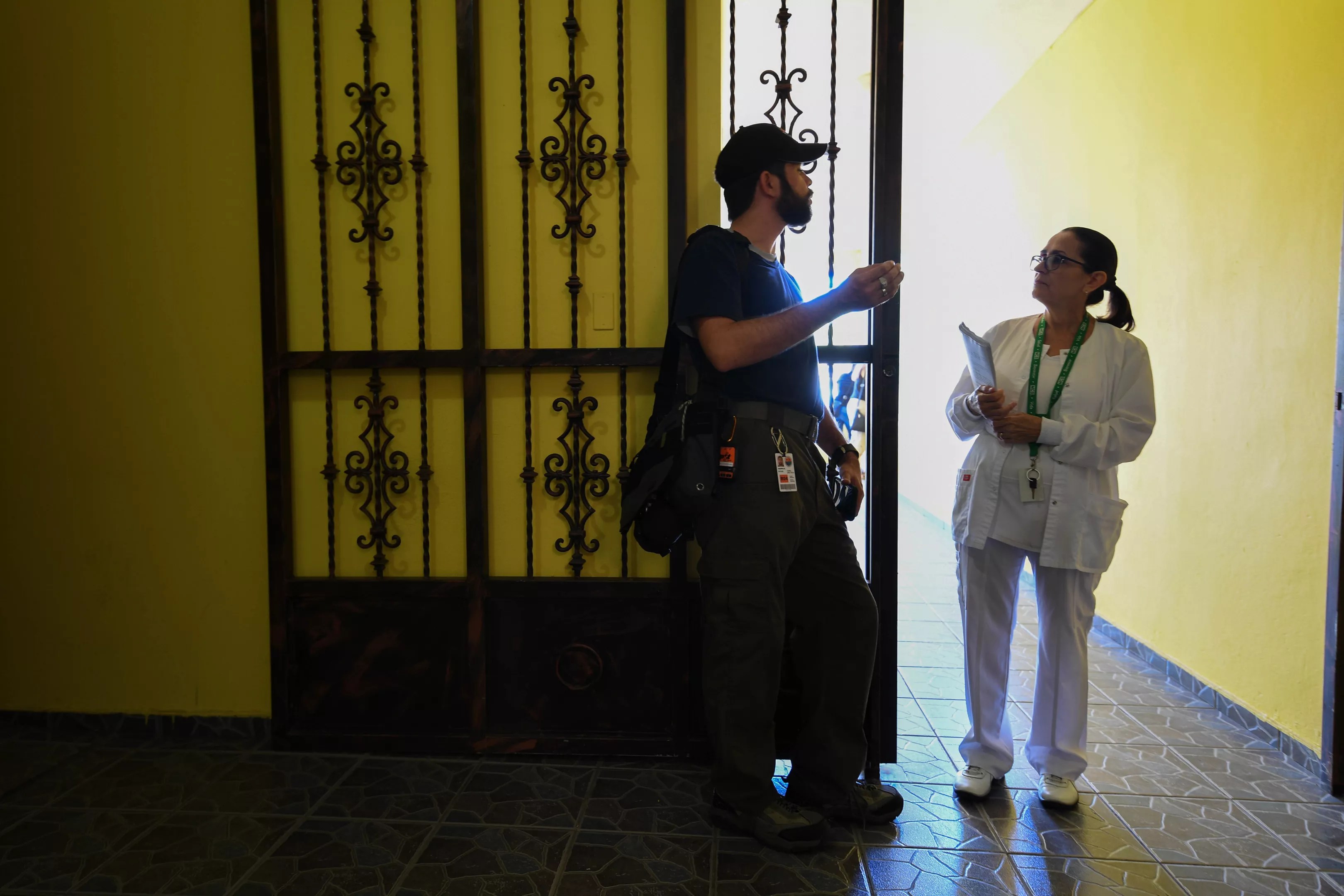 Darrick Kouns tells the head nurse at the Moca hospital that the building will have internet and phone service for the first time since Category 5 Hurricane Maria struck in September.