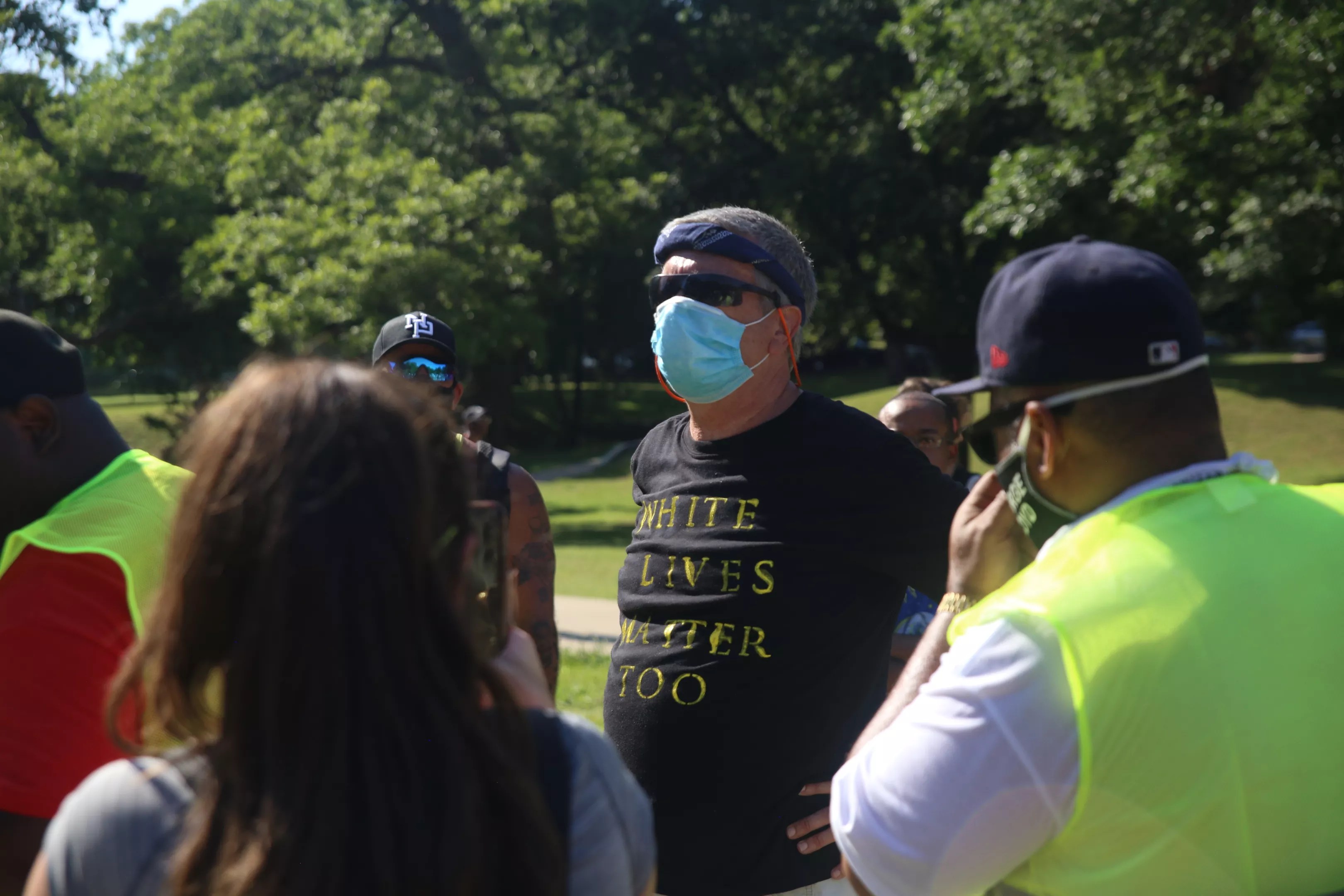A man wearing a “White Lives Matter Too” shirt was escorted away from the event after refusing to leave.