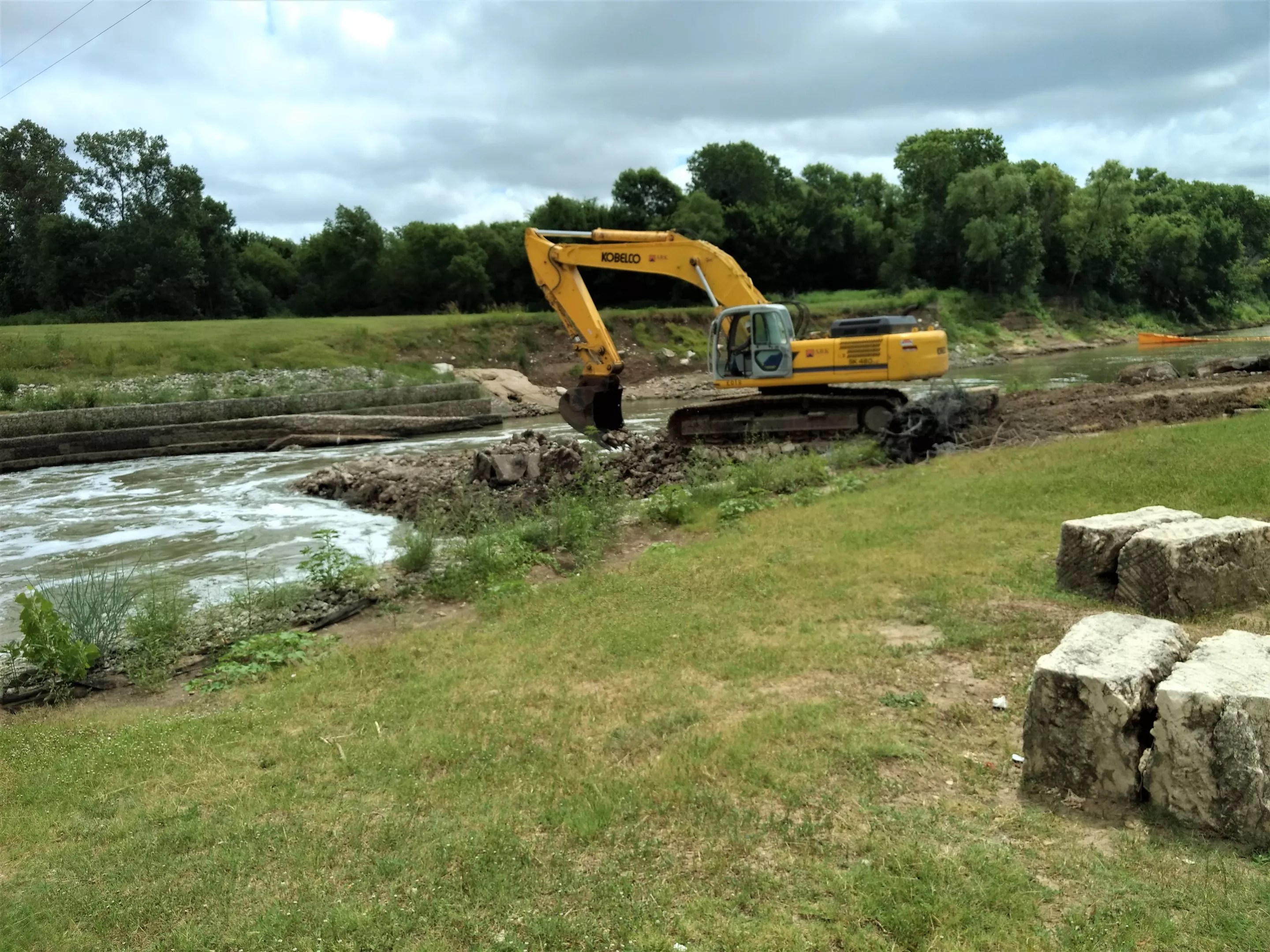 Every time the big claw reached down into the river and ripped loose another bite of that mess, the cheerleaders would all jump up and down and do cartwheels and encourage the people in the bleachers to make a joyful racket with their noisemakers. After all, the tearing out of the fake rapids is the most positive thing City Hall has done on the river in decades.