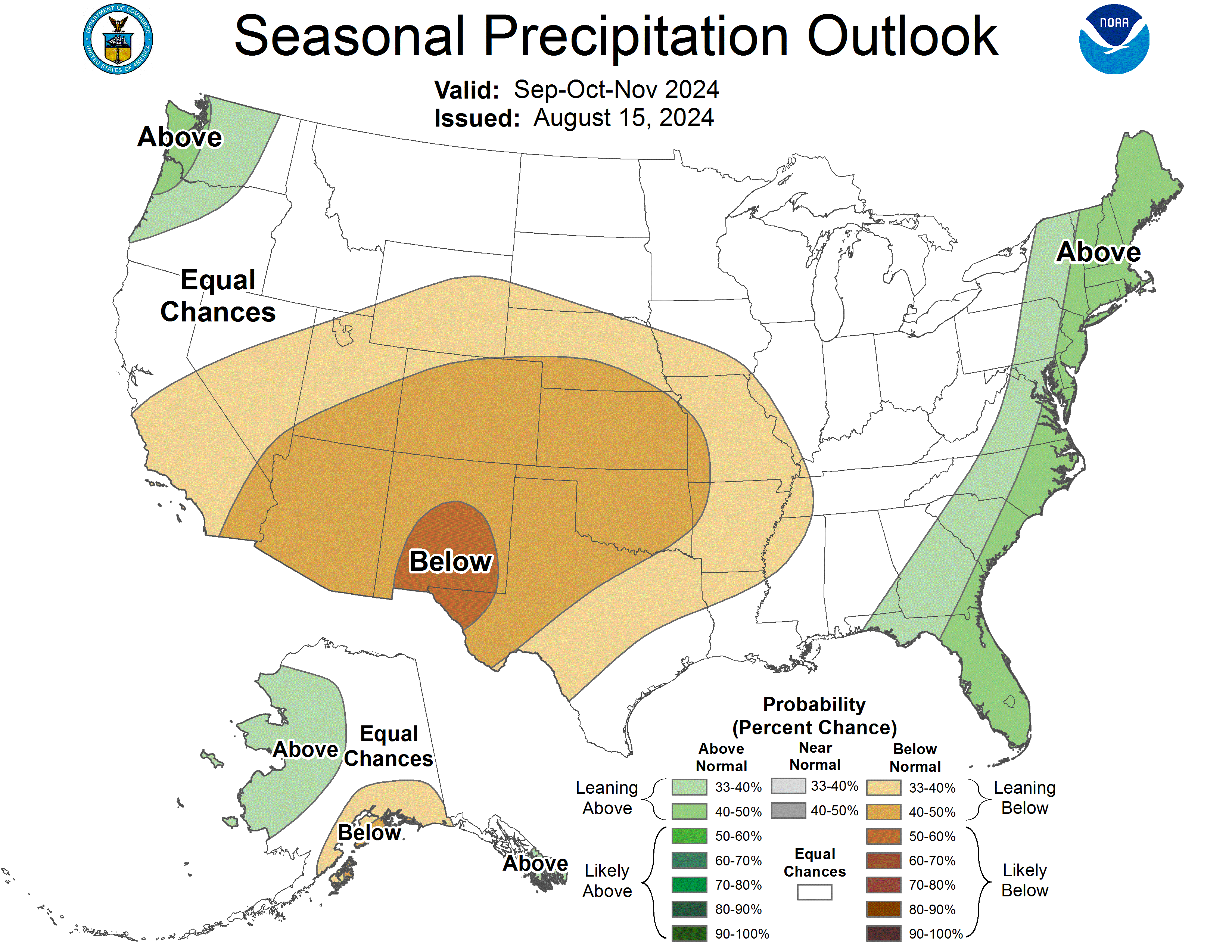 “The [September, October, November] 2024 precipitation outlook depicts elevated probabilities for above-normal precipitation along the East Coast, parts of the Pacific Northwest, and western Alaska,” the NWS report notes. “Below-normal precipitation is favored for the Central to Southern Great Plains, Central Rockies, Southwest, southern California, and southern Alaska.”