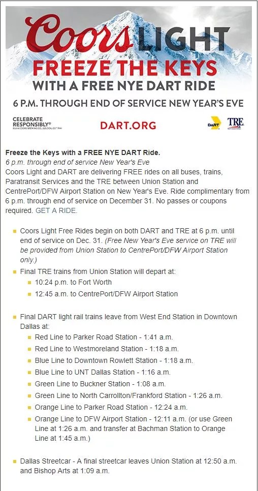 If you’re willing to head home a little before last call, Coors Light and Dallas Area Rapid Transit are teaming up on New Year’s Eve to give everyone in DART’s service area a free ride home. Starting at 6 p.m. Dec. 31 and running through the end of service early New Year’s morning, all DART trains and buses, including the Trinity Railway Express west of DFW Airport, will be available fare free. DART and the brewer want you to “freeze your keys,” as it were.