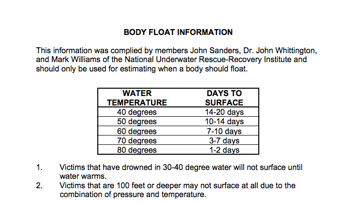 A freshly dead person will typically sink within minutes and rise when the gasses inside the body tissue force it to the surface. Again, temperature plays a big role. The rescue dog organization Paws of Life has a library of useful information for first responders, including this dated but handy chart showing the relationship between water temperature and a body’s reappearance: