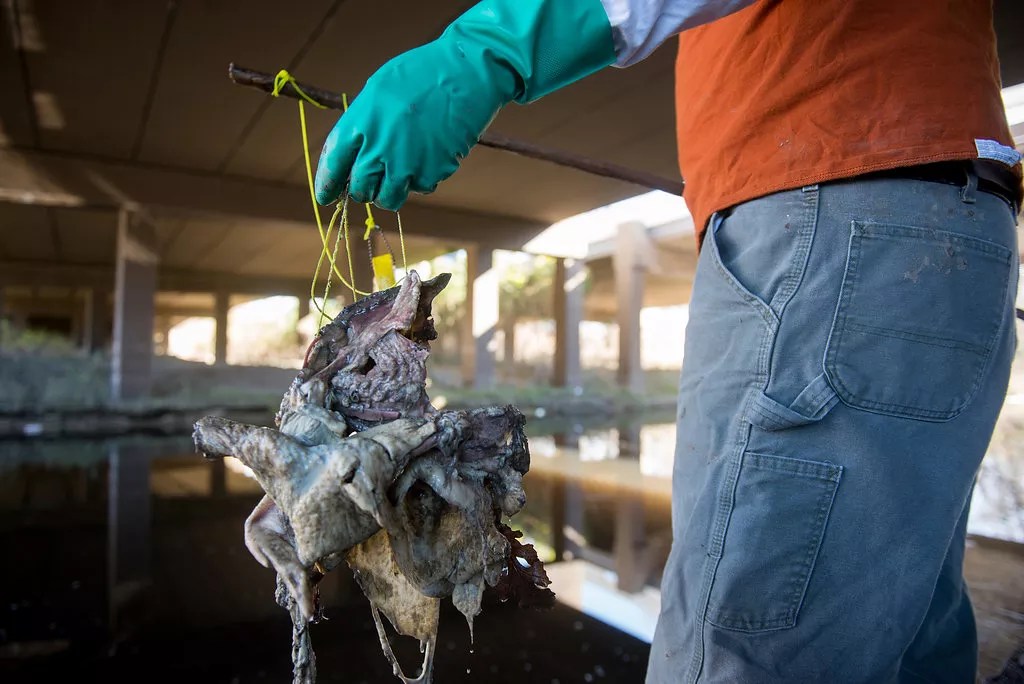 Getting the chicken out of the creek requires a long pole. In a couple of tries, the pole’s tip snags the rope. Dragging the rig back to the shoreline, the remains of the chicken emerge from the black-green gloom. Its skin is in tatters, flowing behind the bird like a cape.