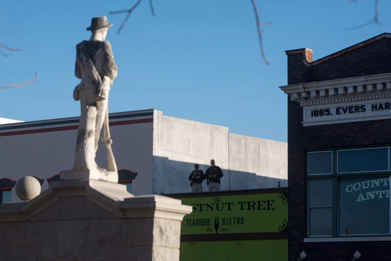 Police on a rooftop at Sunday’s peaceful protest at Denton’s Confederate monument.
