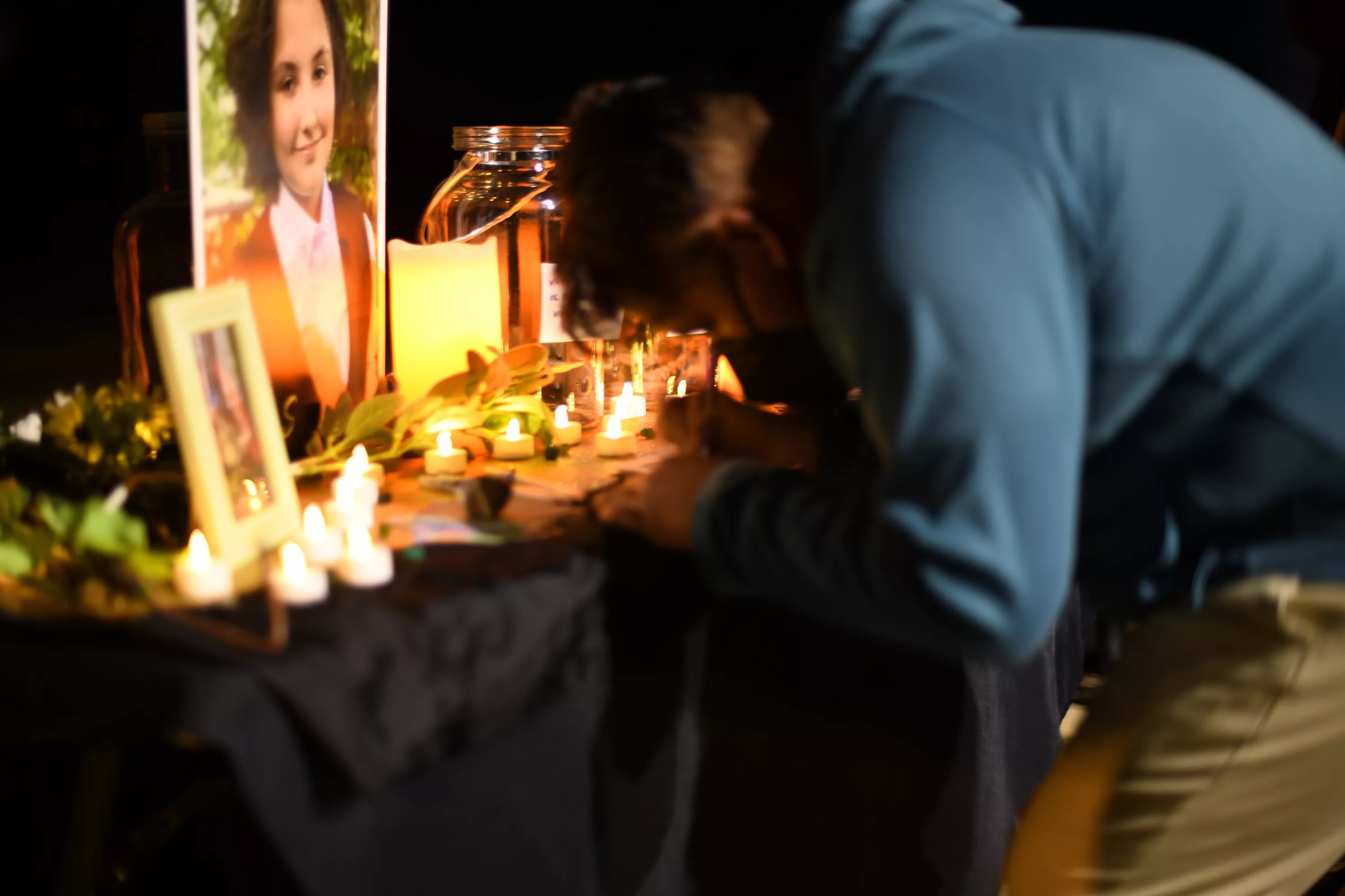 A vigil attendee pays respect during Thursday night’s vigil in Denton.