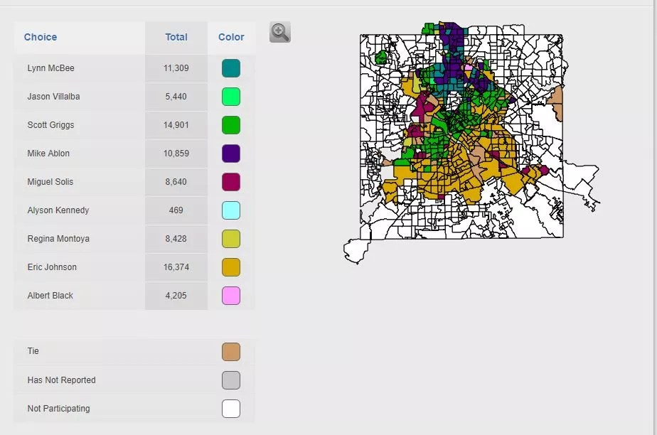 Taking a look at the precinct by precinct map, the first thing that stands out is that there were three distinct bands of voters in the first round. State Rep. Eric Johnson (represented in gold on the map), who finished first over his runoff opponent, Dallas City Council member Scott Griggs, won a band that extends from South Oak Cliff in the southwest to Fair Park and Far East Dallas. Griggs, green on the map, won his own district in North Oak Cliff, along with the central Dallas core that includes downtown, Uptown and East Dallas. McBee and Mike Ablon, two candidates with similar platforms, dominated North Dallas but ended up canceling each other out.