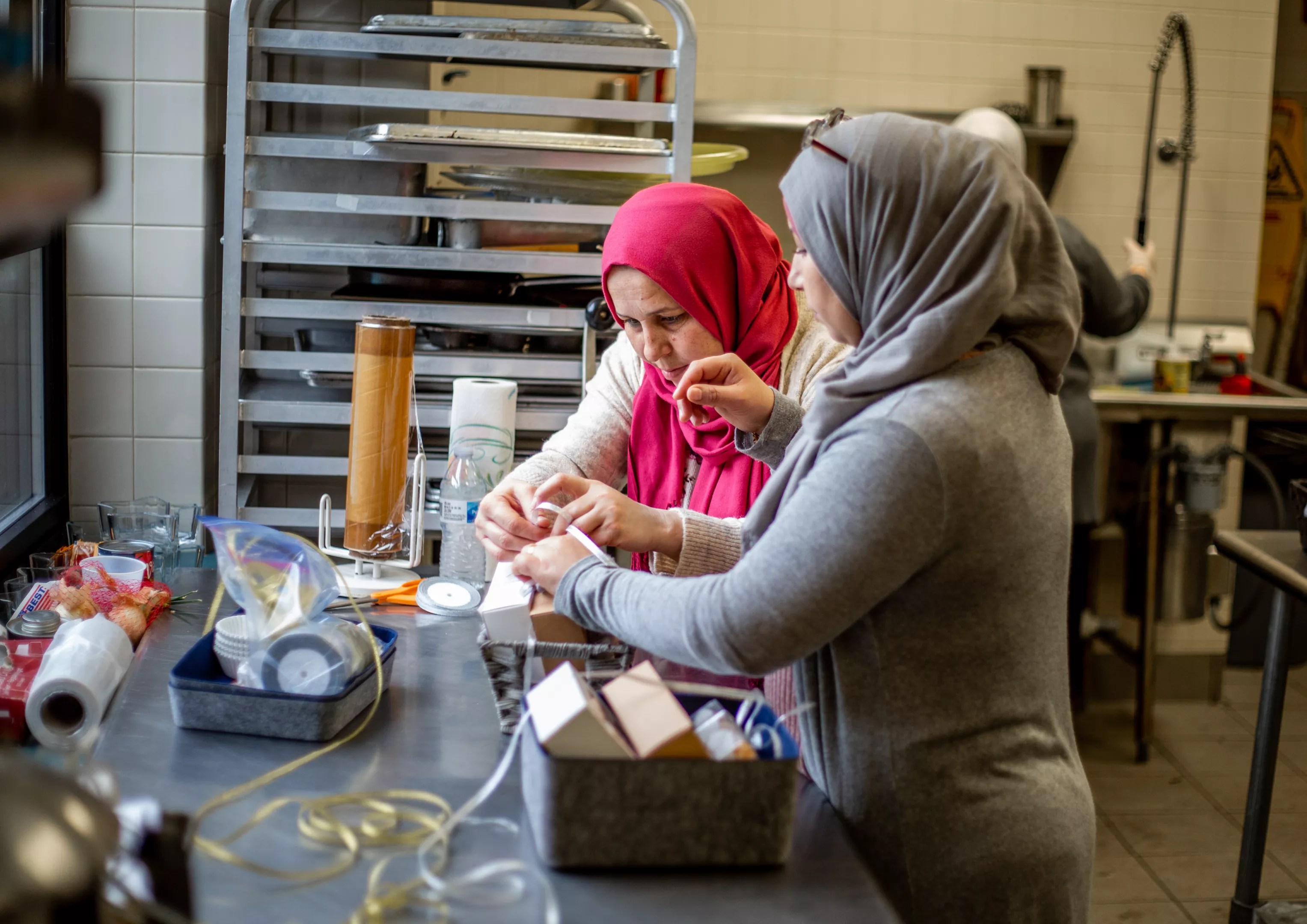 On a stainless steel table under the kitchen window, Rania Alahmad ties gold and silver ribbon around boxes of baked sweets, and Rasha Sultan and Nawarah Shaker load chicken-filled dumplings and stuffed zucchini into foil dishes. The women chat and laugh in Arabic.