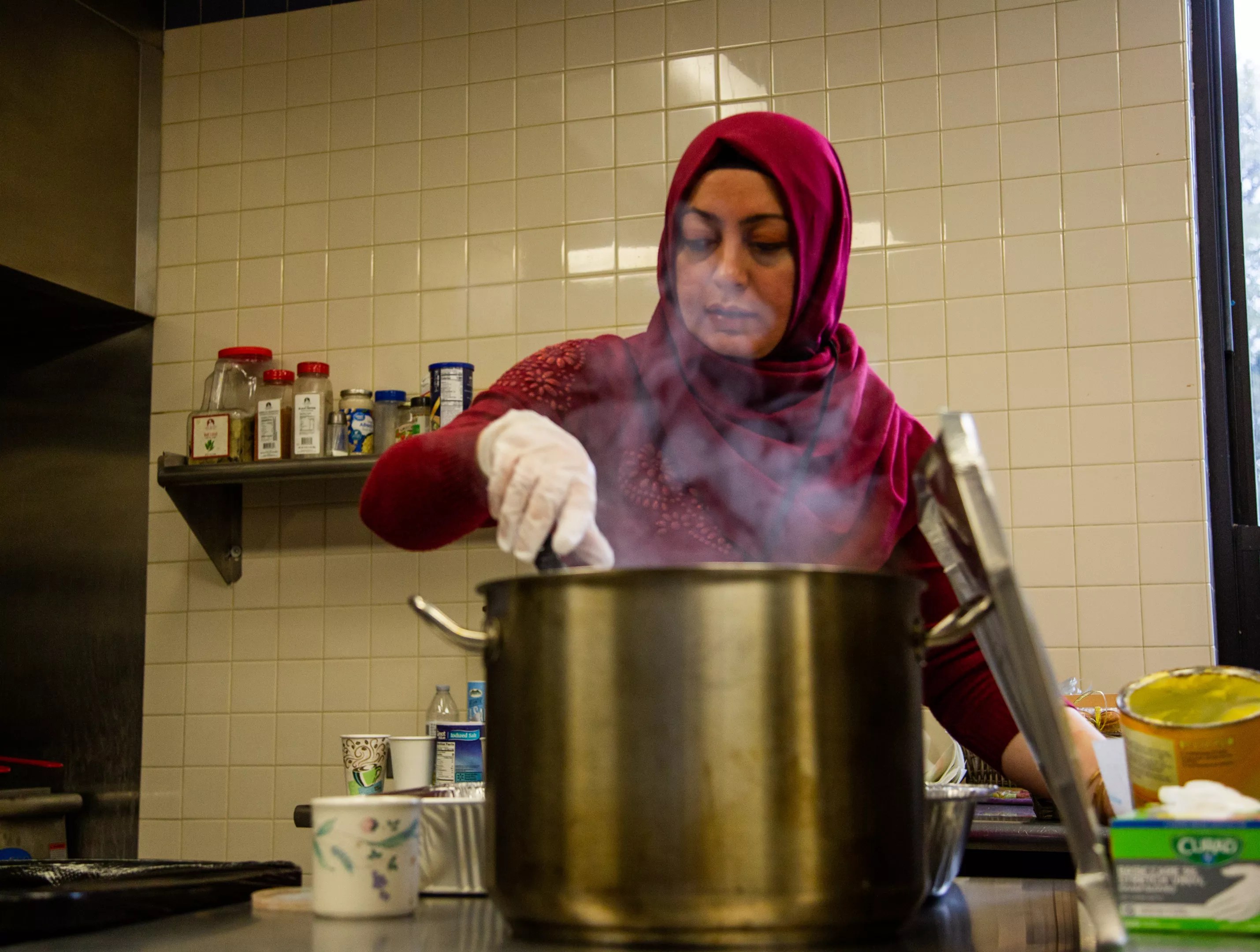 Sunlight seeps into the small commercial kitchen in the Muslim American Society’s Islamic Center as Maissa Alkhadir stirs a steaming pot of rice and potatoes. Reaching to a shelf above the stove, she grabs a plastic canister of dried spices and sprinkles some into the pot.